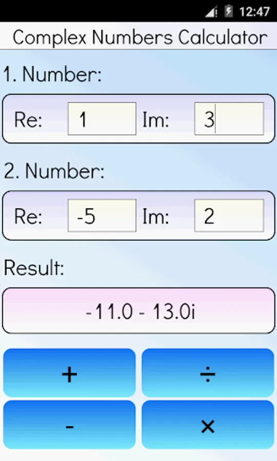 This is a free mathematical calculator for complex numbers, which is able to to add, subtract, multiply and divide complex numbers.