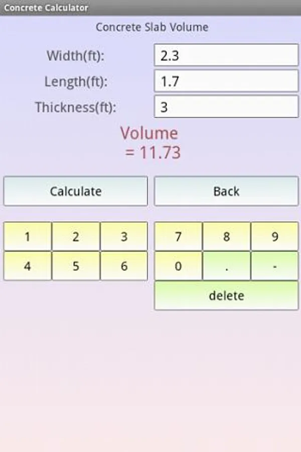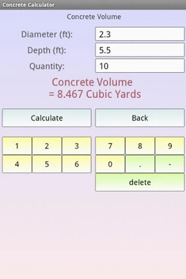 - Concrete volume calculator: You are able to calculate the concrete volume. Just enter the diameter (in feet), depth (in feet) and quantity.