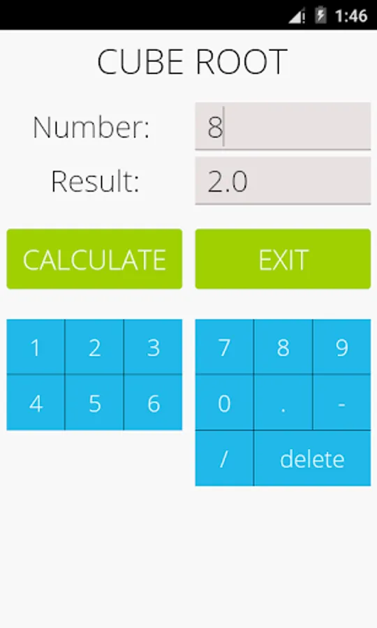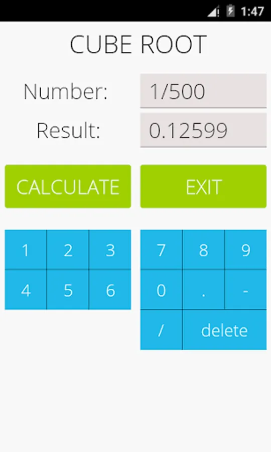 This free app is able to calculate the cube root of a number. Integer numbers, decimal numbers and fractions are supported.