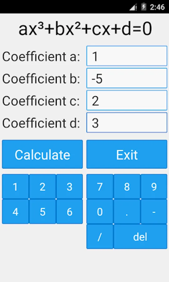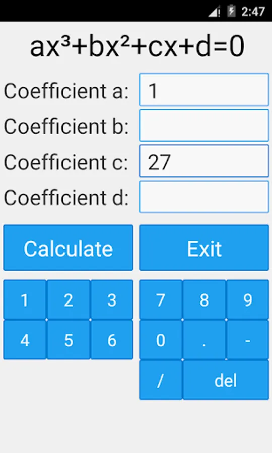This is a free mathematical calculator which is able to solve cubic equations. The app is able to find both real and complex roots. Just enter the coefficients / parameters of the equation.