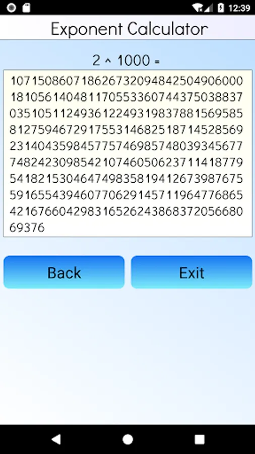The app supports big numbers. Example: You can show the result of 2 to the power of 1000.