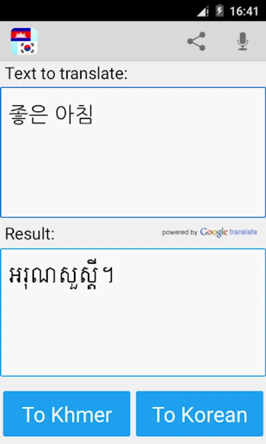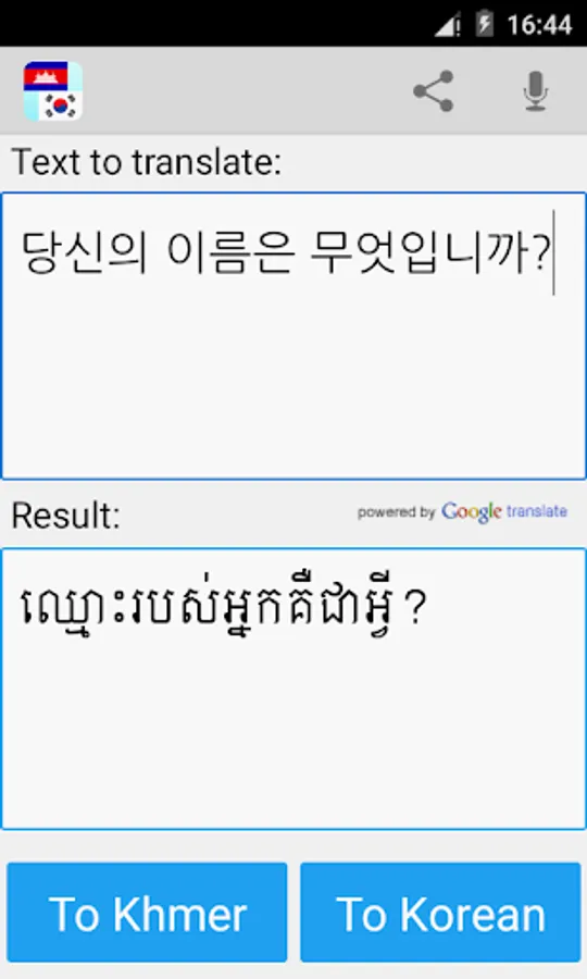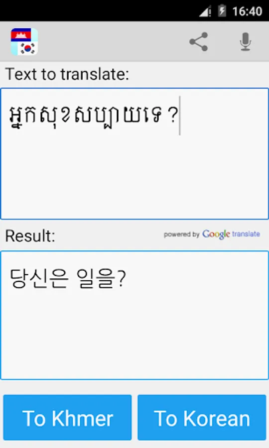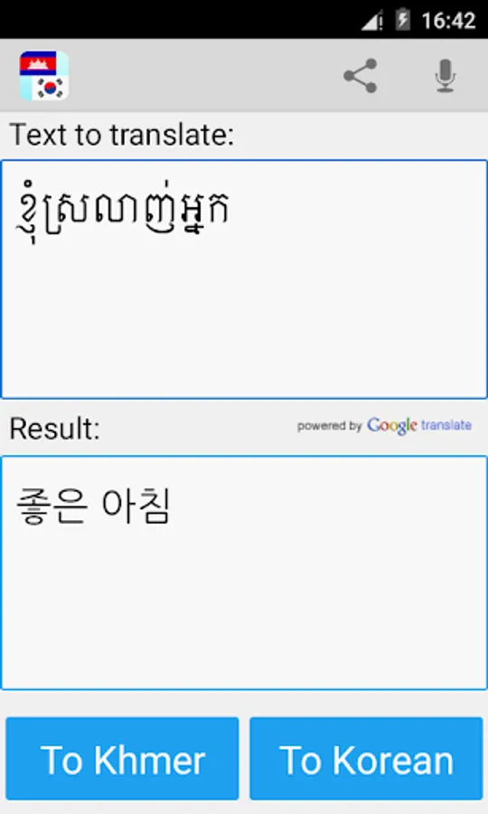This free app is able to translate words and texts from korean to khmer, and from khmer to korean.
