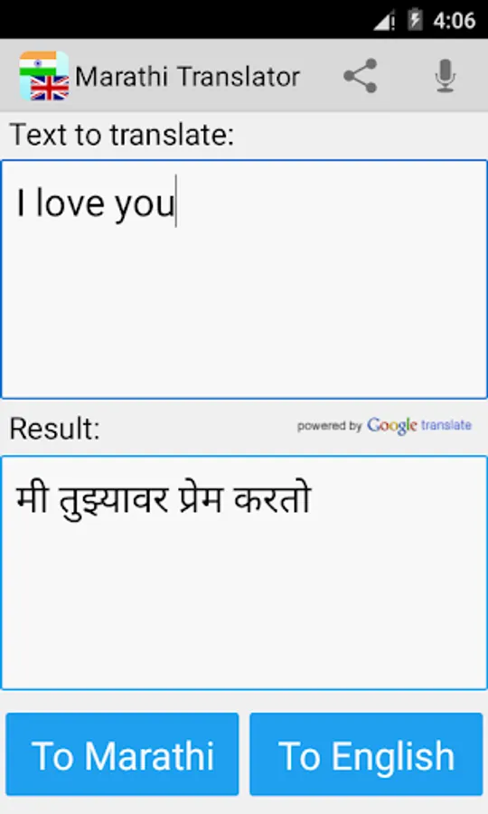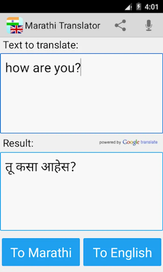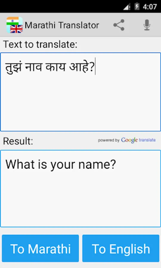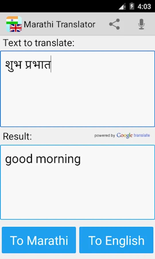 This free app is able to translate words and texts from english to marathi, and from marathi to english.