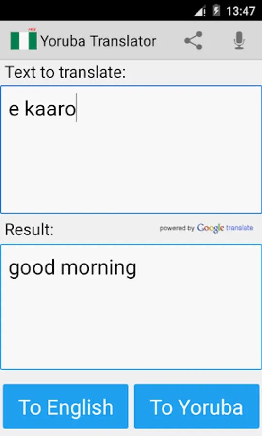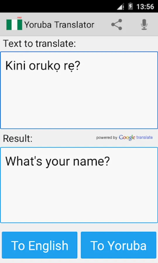 This free app is able to translate words and texts from english to yoruba, and from yoruba to english.