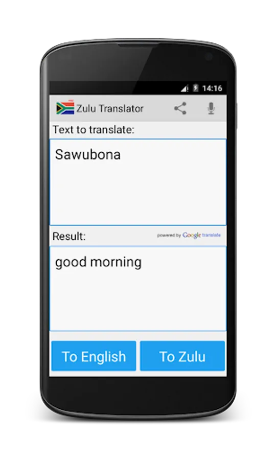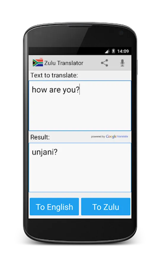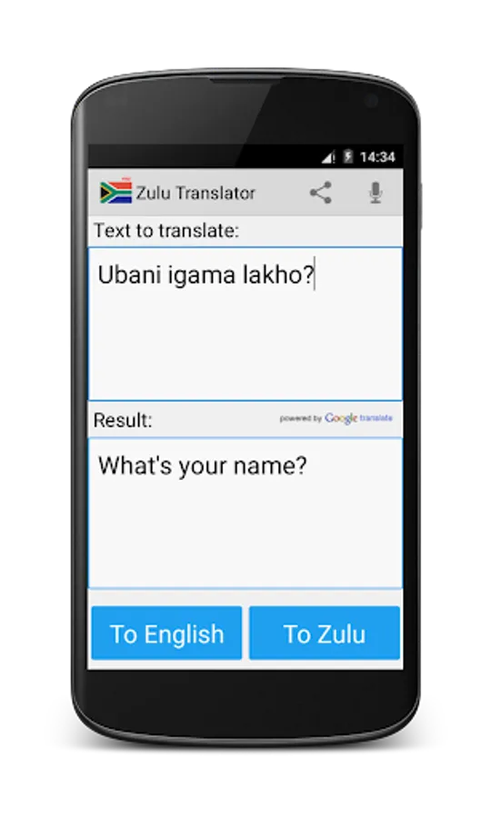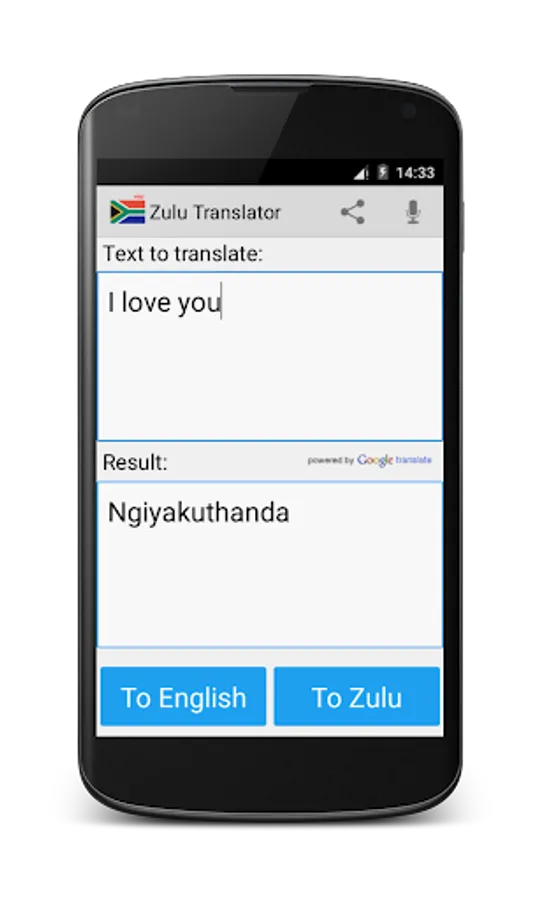This app is able to translate words and texts from english to zulu, and from zulu to english.