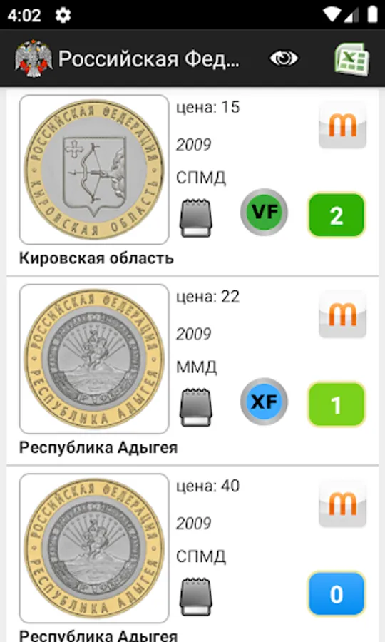 You can export to excel any generated lists (for example, a list of coins which is not enough in the collection or a list for exchange from a certain series, or a list of coins of a certain denomination)