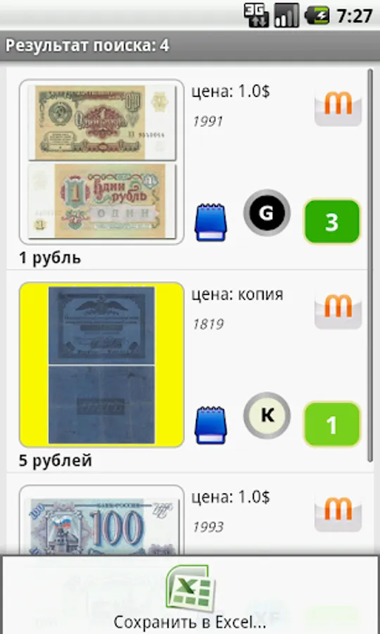The possibility of exporting various lists in excel. You can search for the supply of banknotes in the online store. For the convenience of rare banknotes vydeliny a yellow background, and rare - red. Users will be able to get acquainted with the approximate cost of banknotes.
