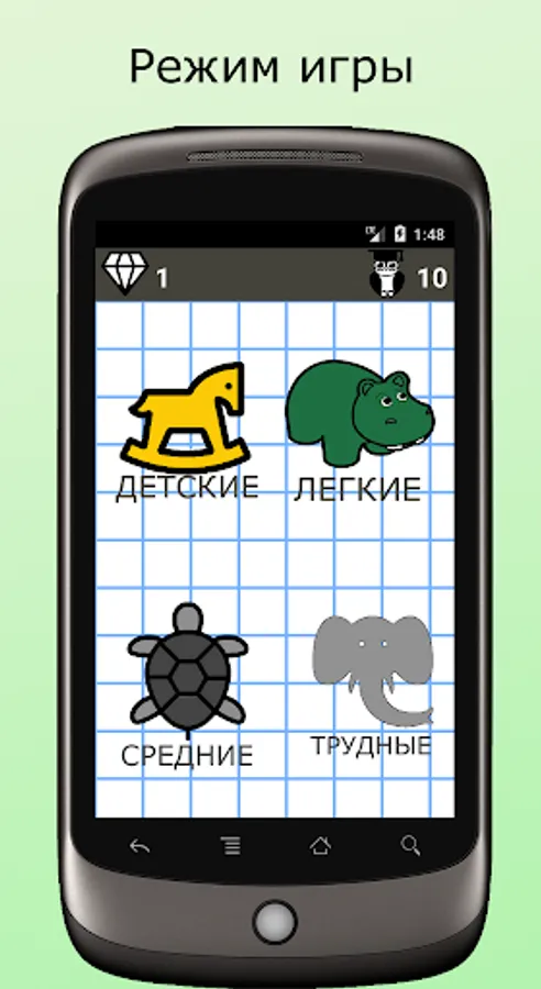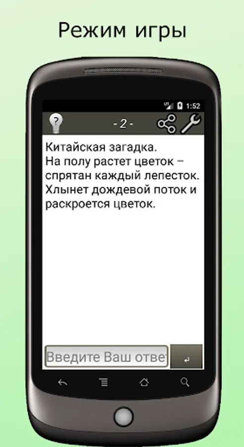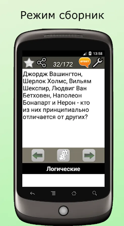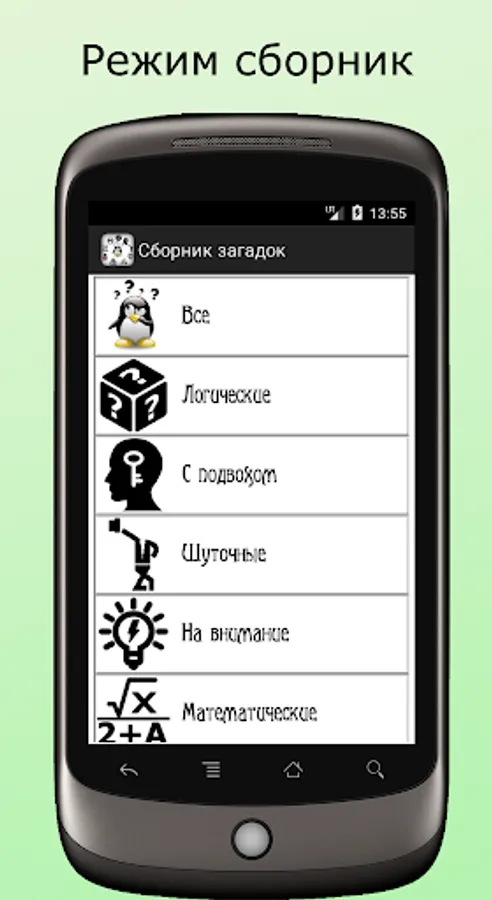 collection mode includes a collection of all sorts of interesting puzzles, puzzles, riddles, charades, danetok. The answer is shown only after pressing the button, which makes it possible to reflect on the mystery. Collection of all time updated with new puzzles.