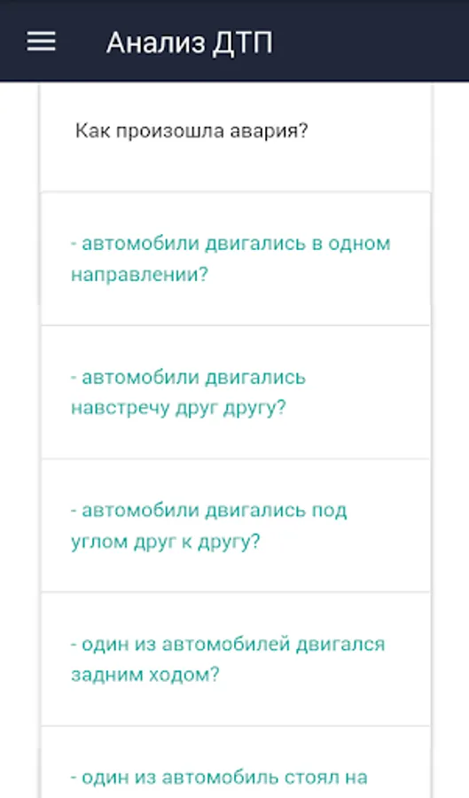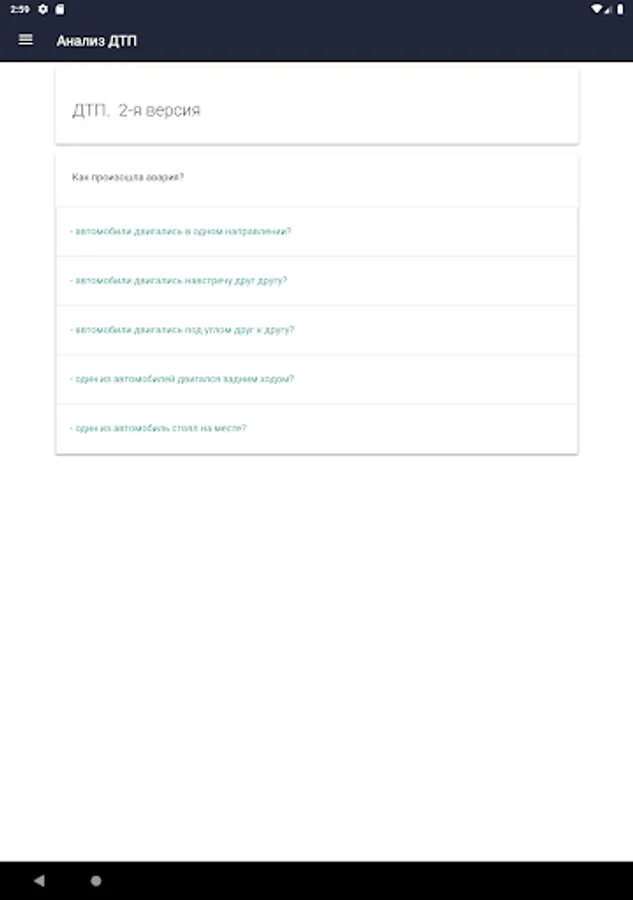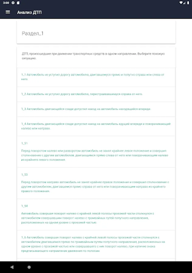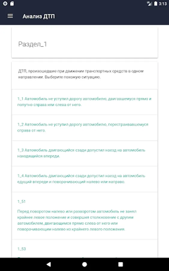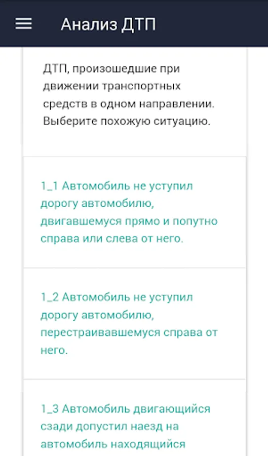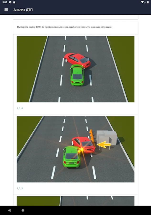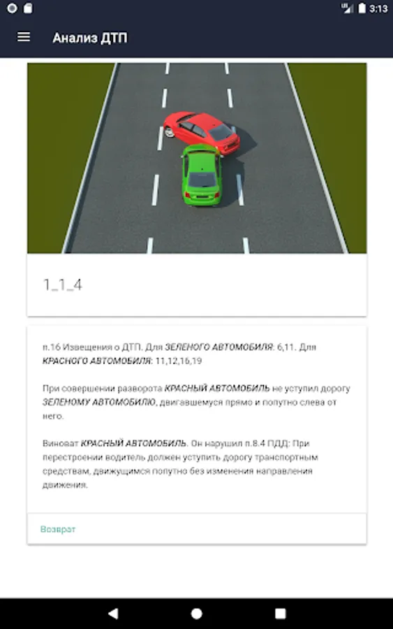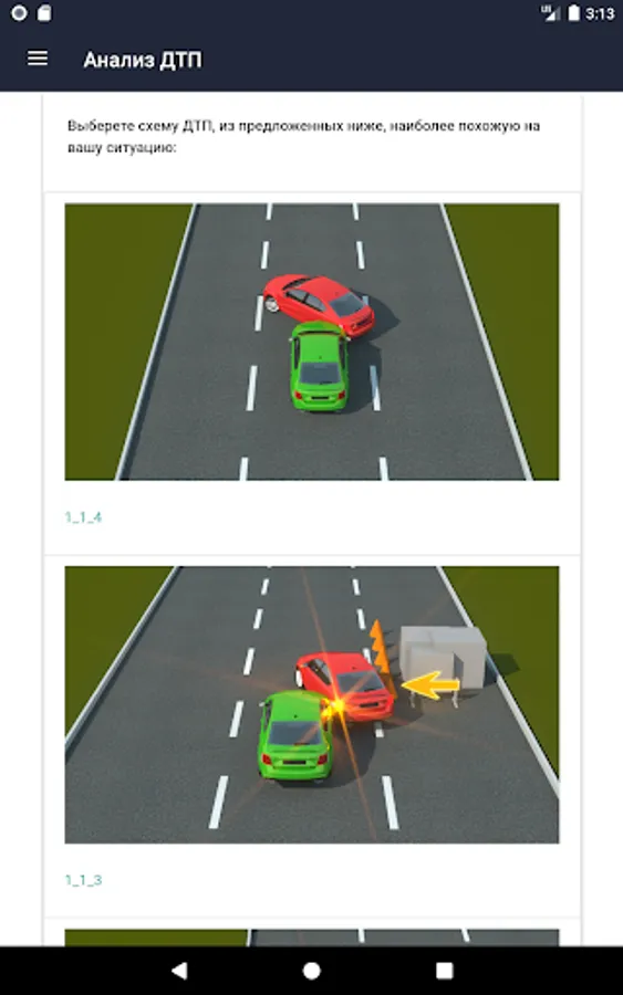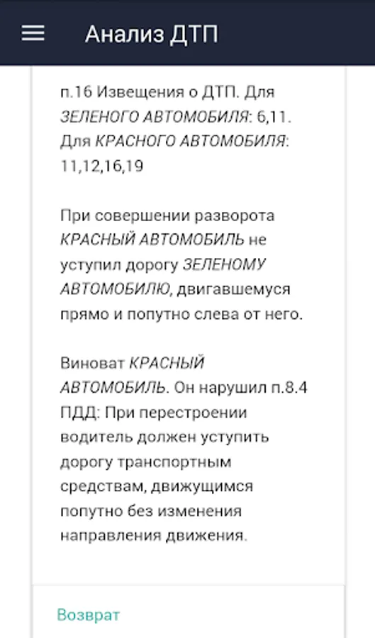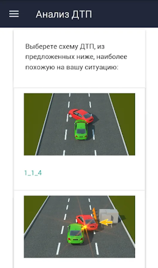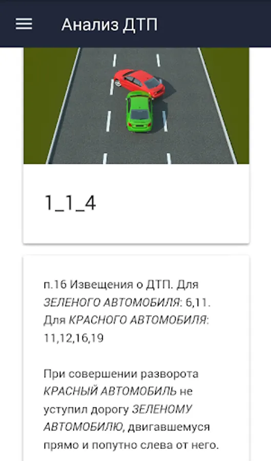 This application will allow you to compare your situation with videos of the most typical car collisions to understand who is to blame for the situation on the basis of which paragraphs of the rules of the road and what sanctions can be applied to you and the second road user in the event of an accident by traffic police.