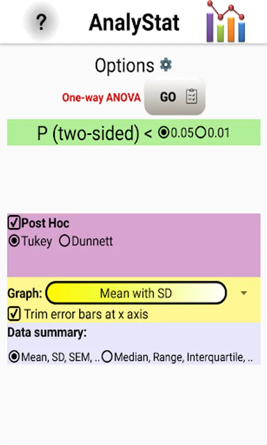 - Two-way ANOVA (with Tukey's, Dunnet's and LSD post-hoc tests)