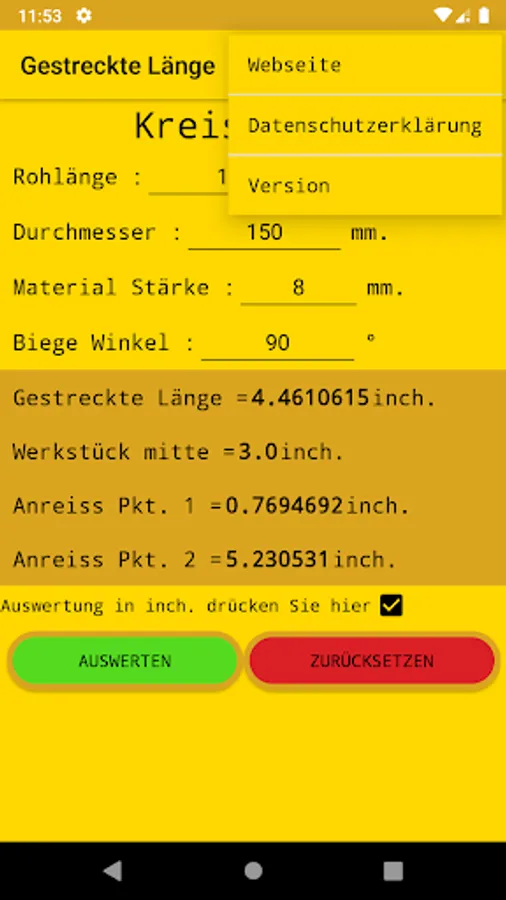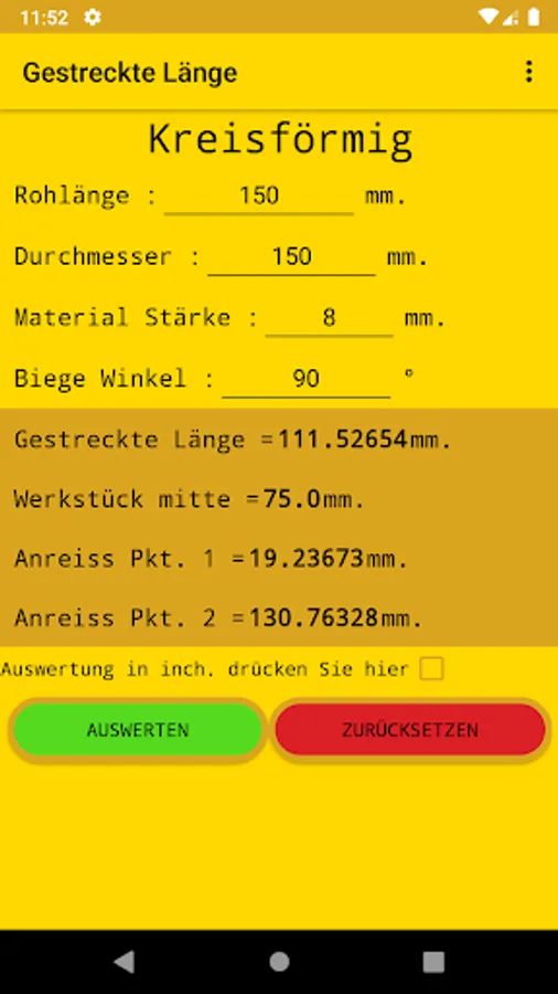 Activating the checkbox converts the result from the unit of measure millimeters to inches.
