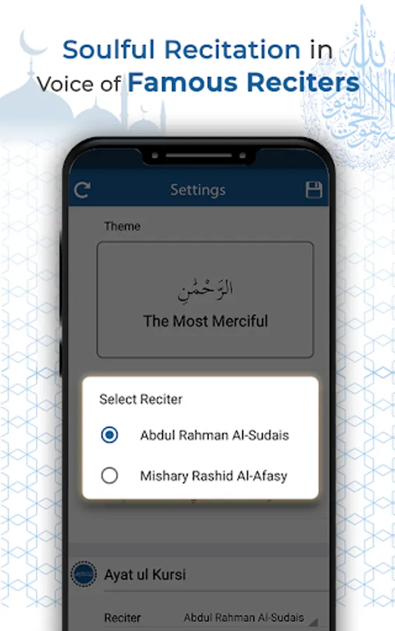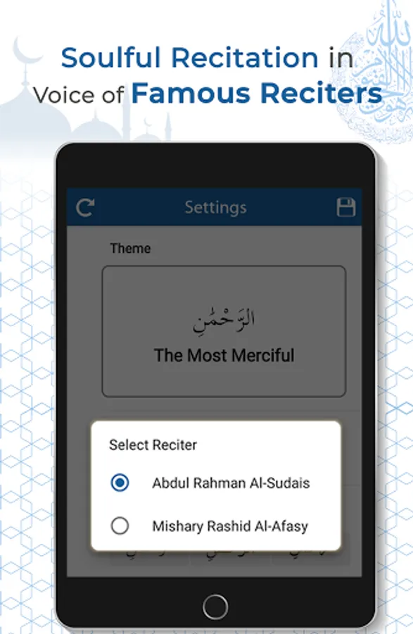 • Soulful Audio Narration in voices of two renowned Reciters: Abdul Rahman Al-Sudais and Mishary Rashid Al-Afasy.