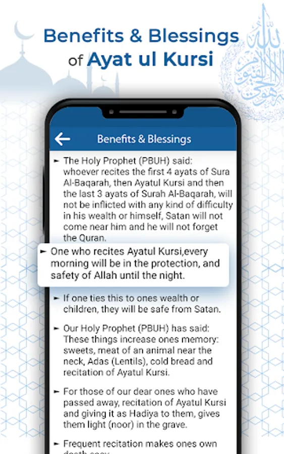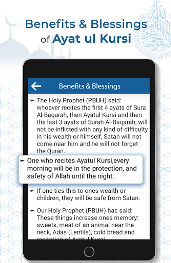 • Benefits and Blessings Part includes all the Prophetic PBUH Sayings about virtues of reciting this extremely hallowed Ayah of Quran Pak.