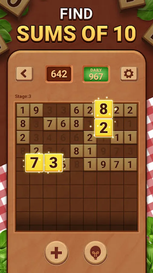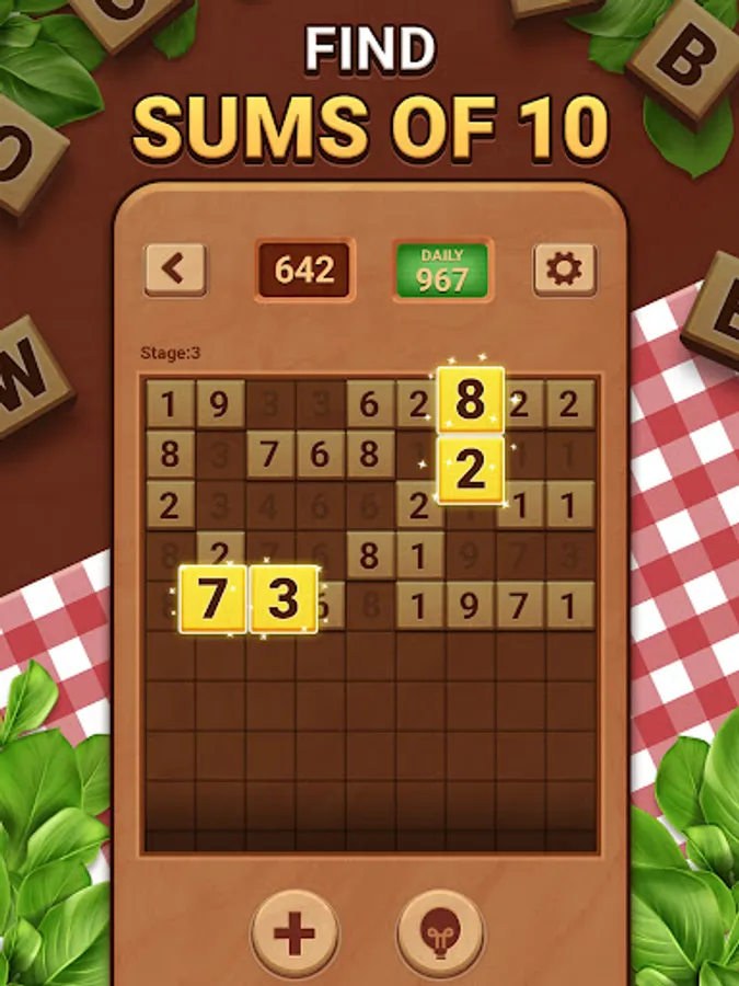 Woodber is a true legend among number games and puzzles. This easy mind game is also known as Numberama, Number Match, Take Ten, Match Ten, Merge Number or 10 Seeds. You can play it either online or offline by using a sheet of paper, but nowadays, we prefer mobile versions of tile puzzle games, which you can play on the go :) Solving a puzzle a day will help you with logic, memory, and math skills training!