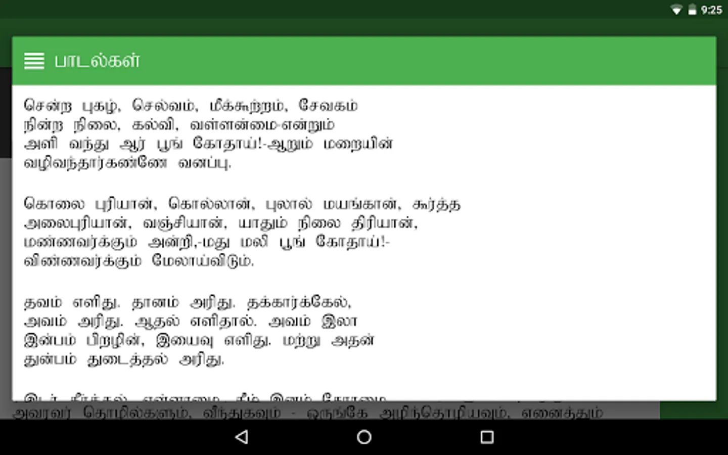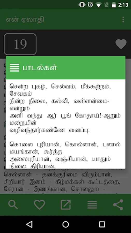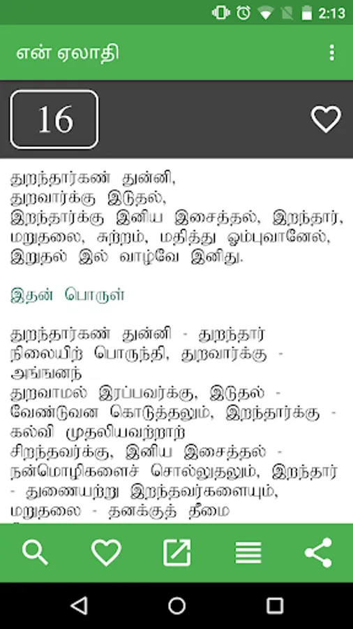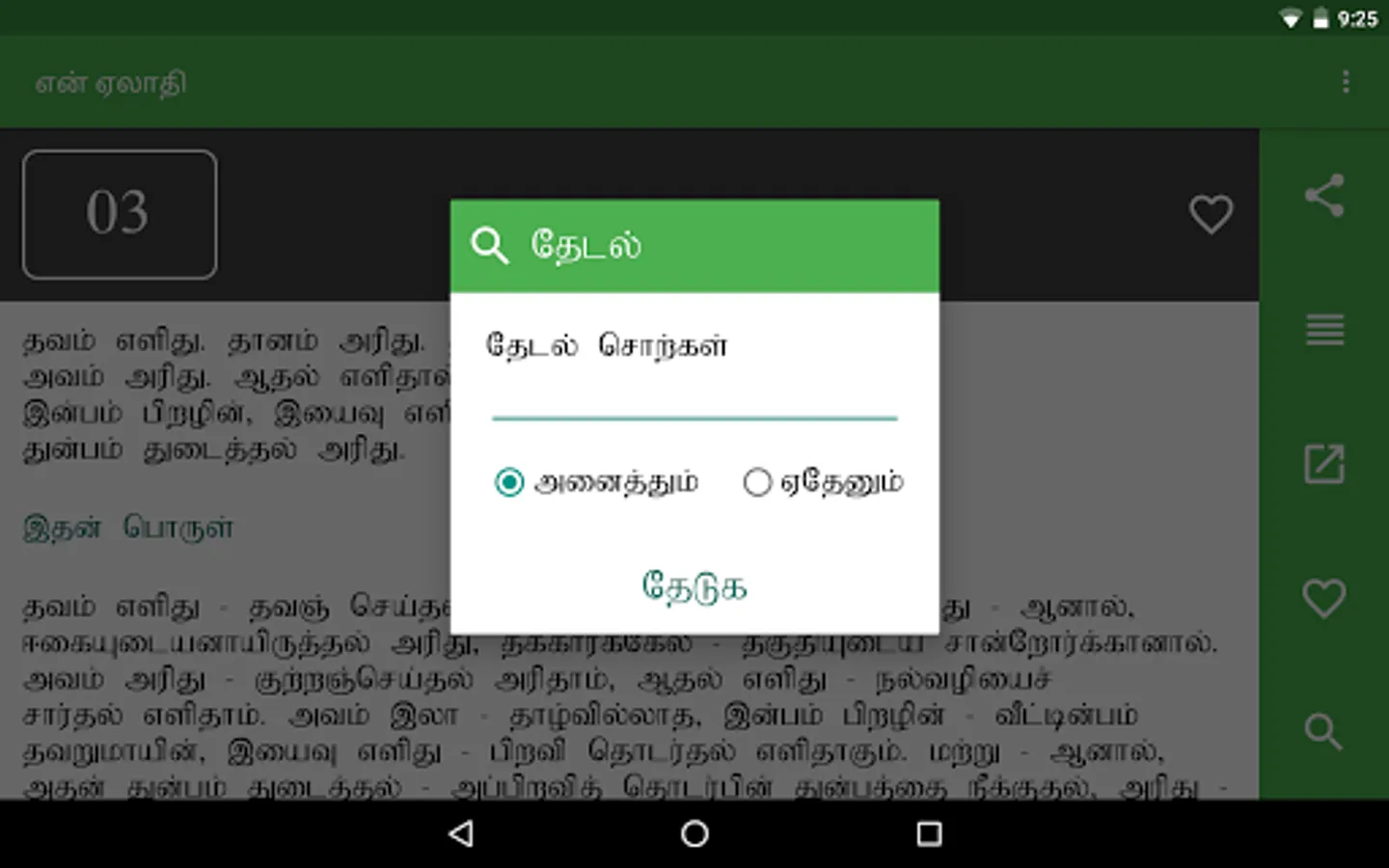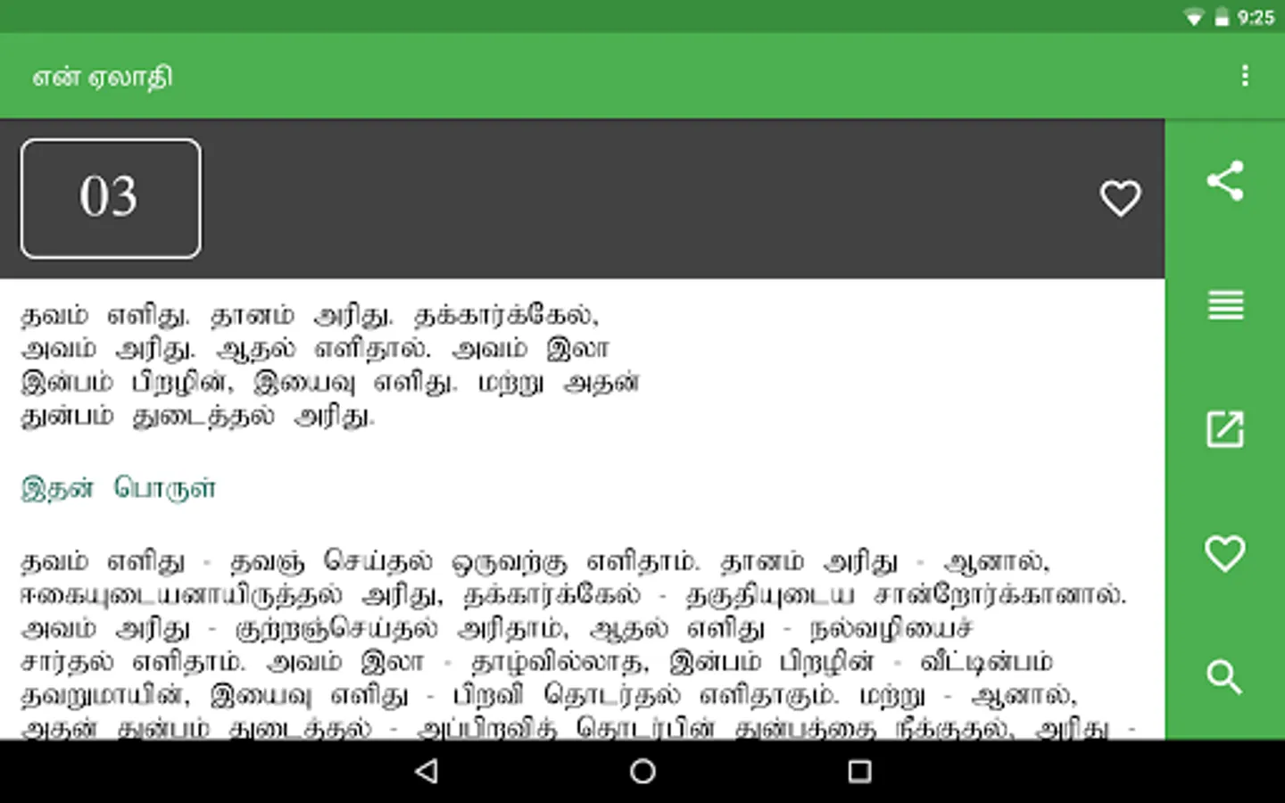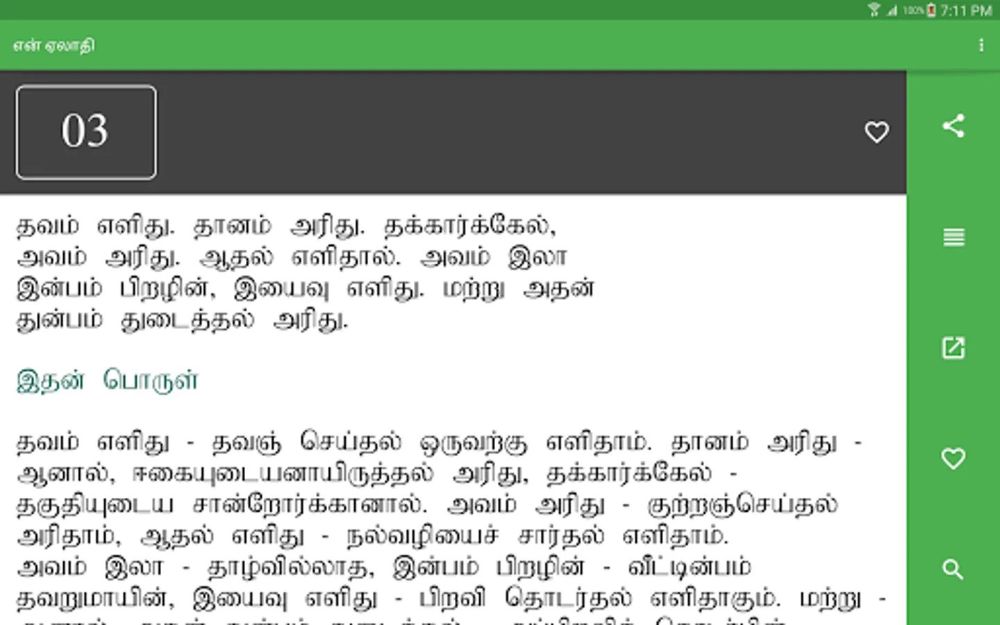 en Aelaadhi (என் ஏலாதி) is an android application that contains whole of Aelaadhi (ஏலாதி) written by Mr. Kanimaedhaaviyaar (திரு. கணிமேதாவியார்). No matter what android device you have Nexus 4, Galaxy S III or Nexus 7. Our UI fits perfect to your screen size.