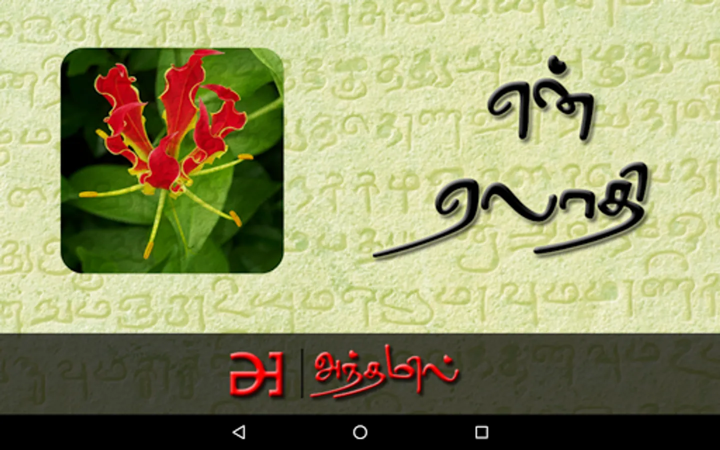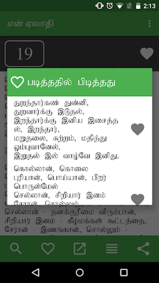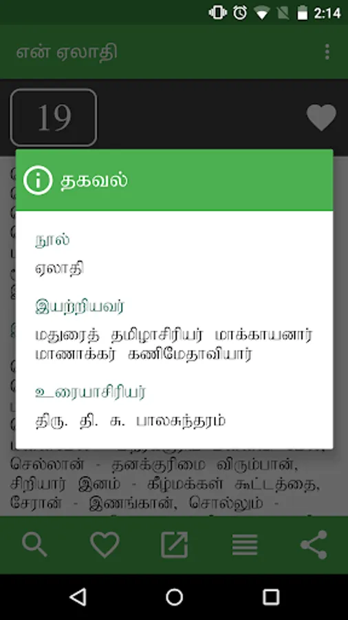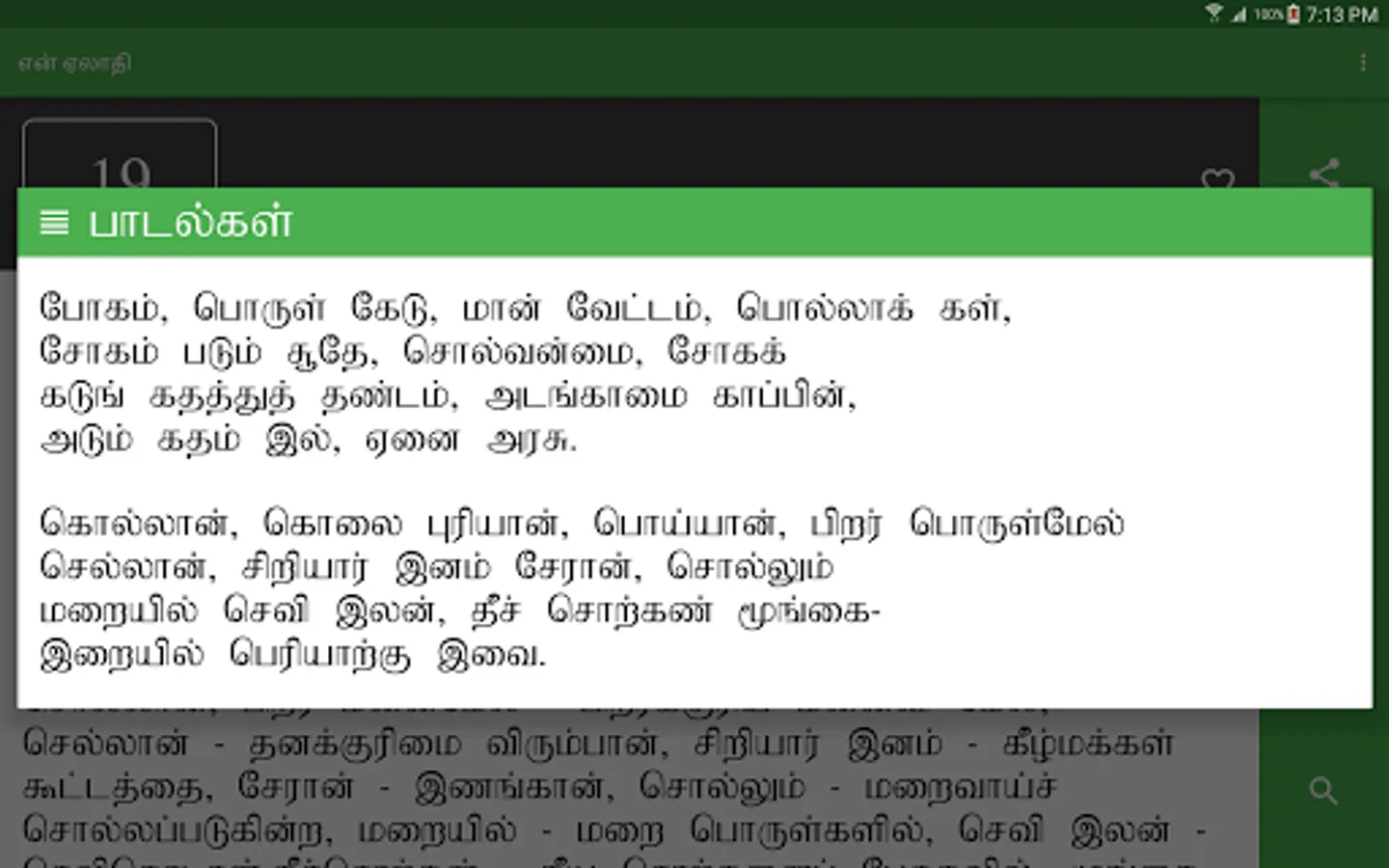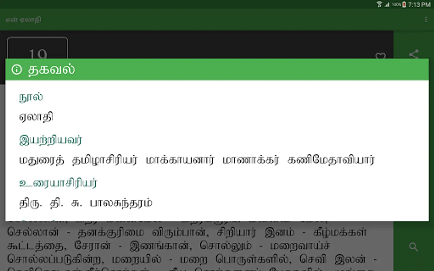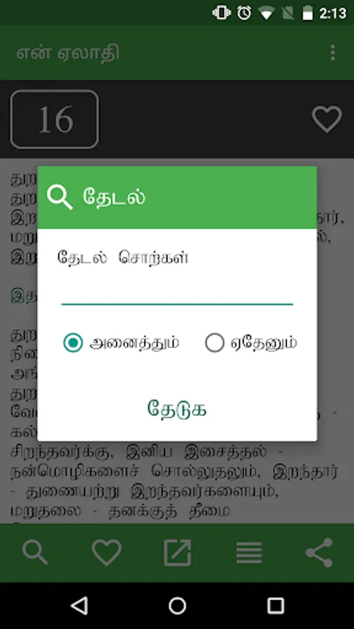 en Aelaadhi (என் ஏலாதி) is an android application that contains whole of Aelaadhi (ஏலாதி) written by Mr. Kanimaedhaaviyaar (திரு. கணிமேதாவியார்). No matter what android device you have Nexus 4, Galaxy S III or Nexus 7. Our UI fits perfect to your screen size.