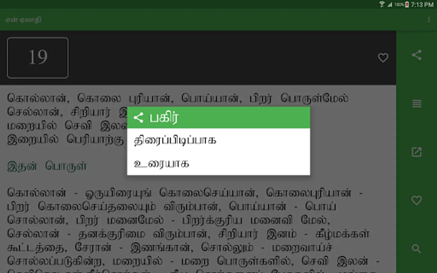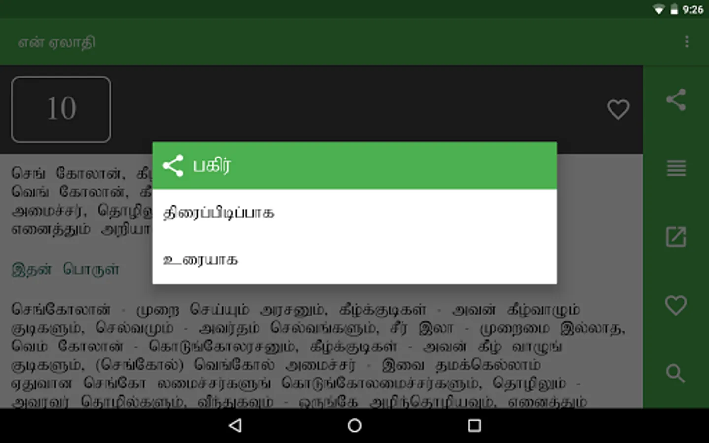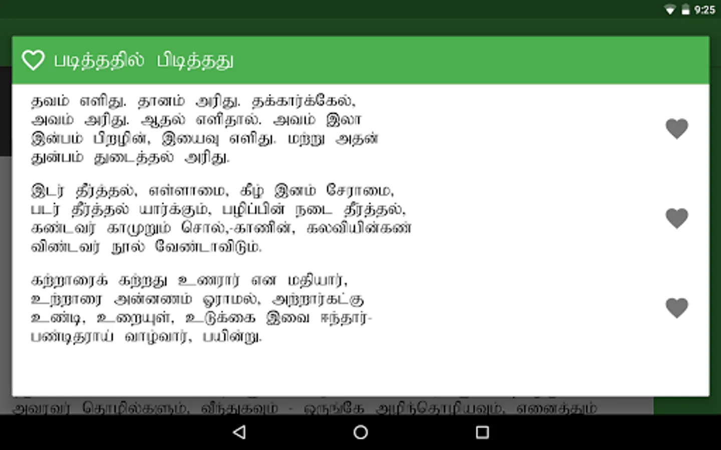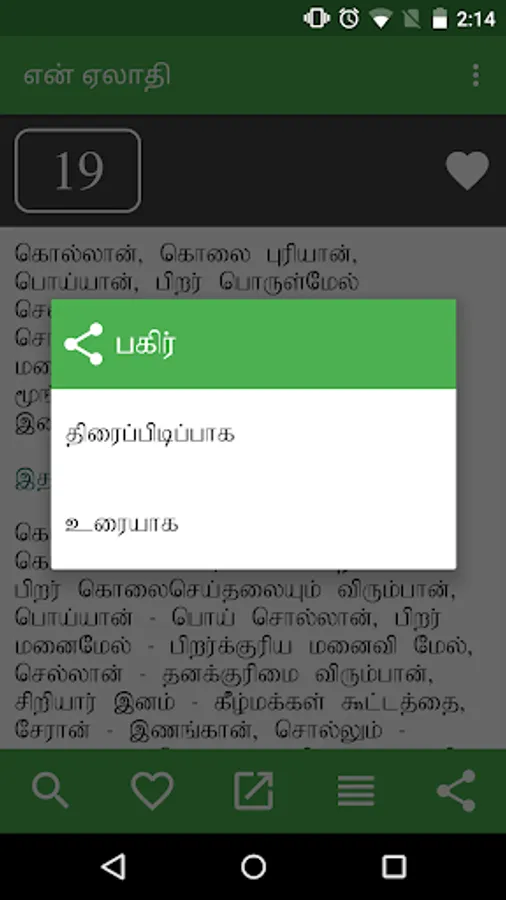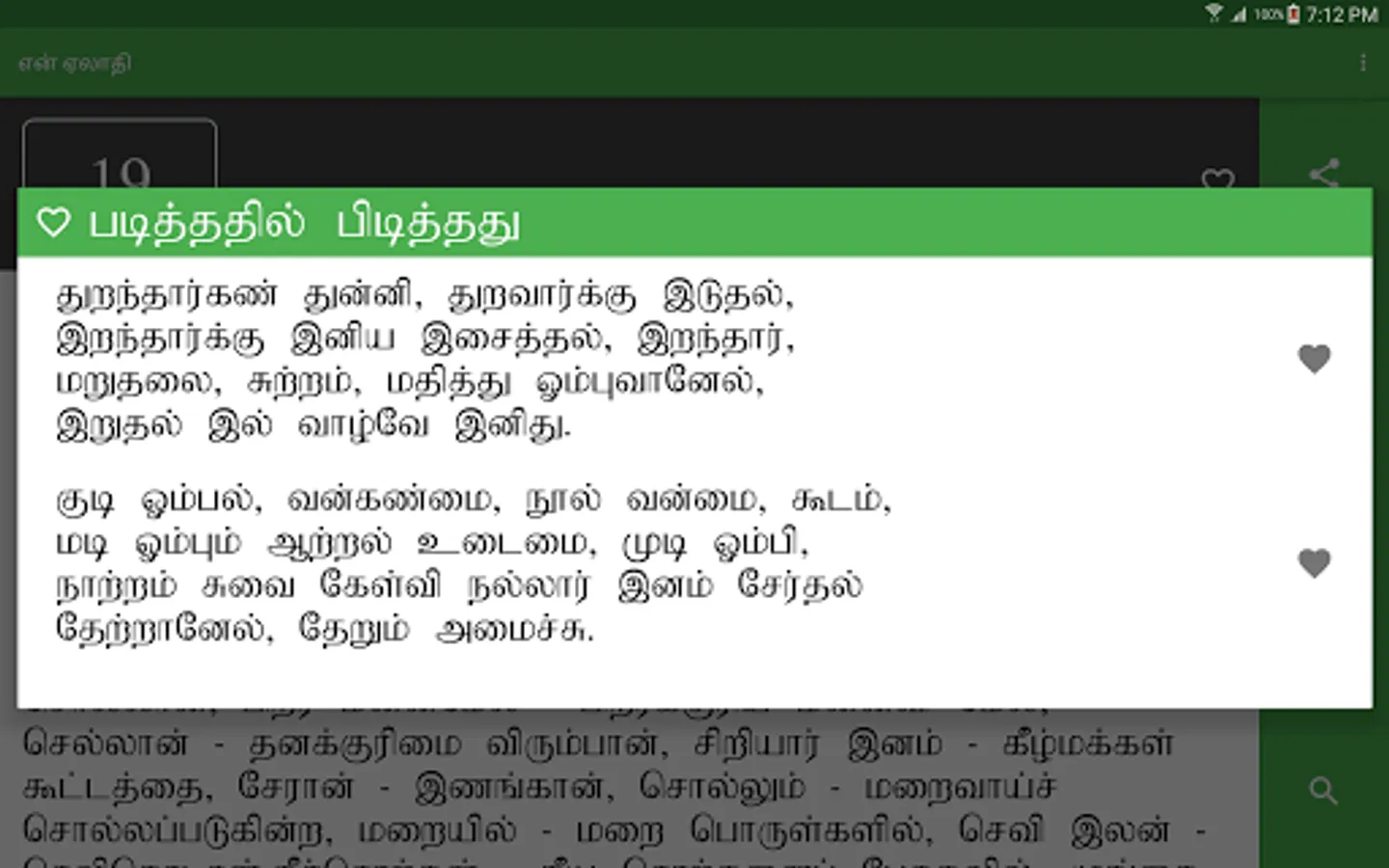 en Aelaadhi (என் ஏலாதி) is an android application that contains whole of Aelaadhi (ஏலாதி) written by Mr. Kanimaedhaaviyaar (திரு. கணிமேதாவியார்). No matter what android device you have Nexus 4, Galaxy S III or Nexus 7. Our UI fits perfect to your screen size.