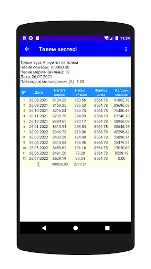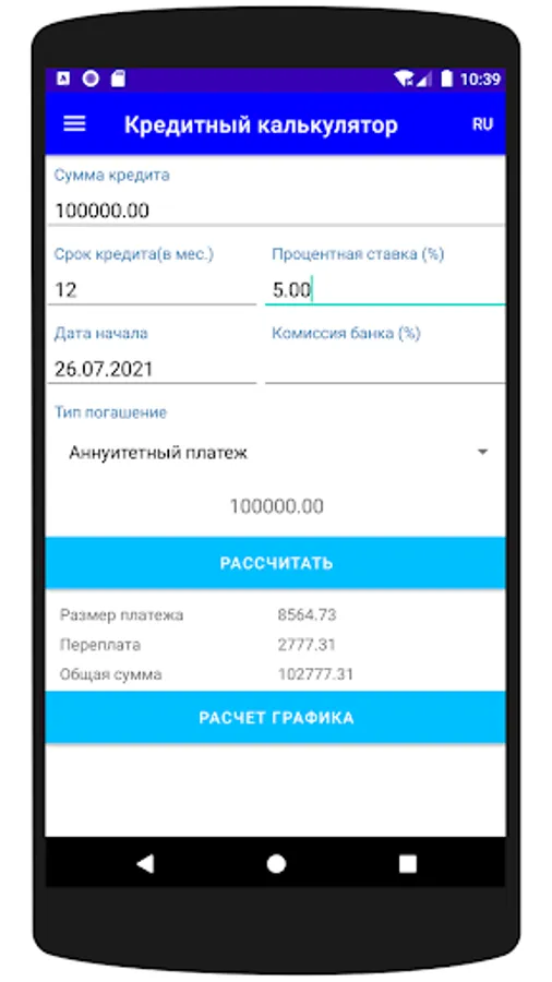 Приложение предназначено для расчета график погашения кредитного договора. Задавая несколько параметров кредита, вы можете увидеть ежемесячные платежи по основному догу и по процентам.
