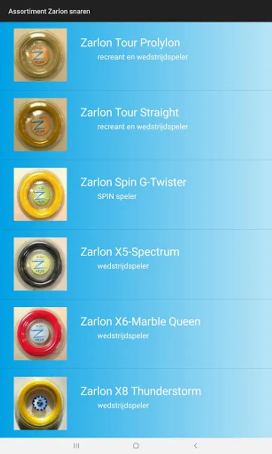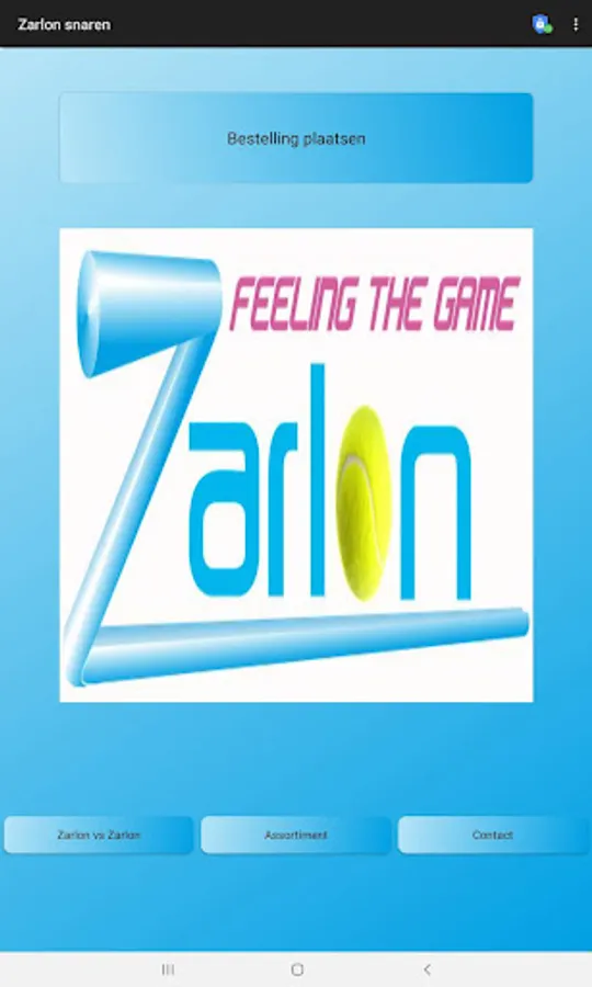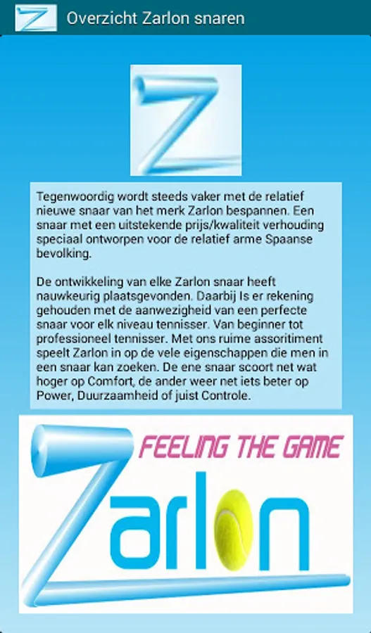 In this app a lot of information about the new Zarlon strings. These can also be ordered via the app from the Zarlon representative in the Netherlands. Ordering is automated via email, Whatsapp or SMS. The assignment will be included in your e-mail program, your Whatsapp or SMS app. After this you can decide yourself to pass on the order.