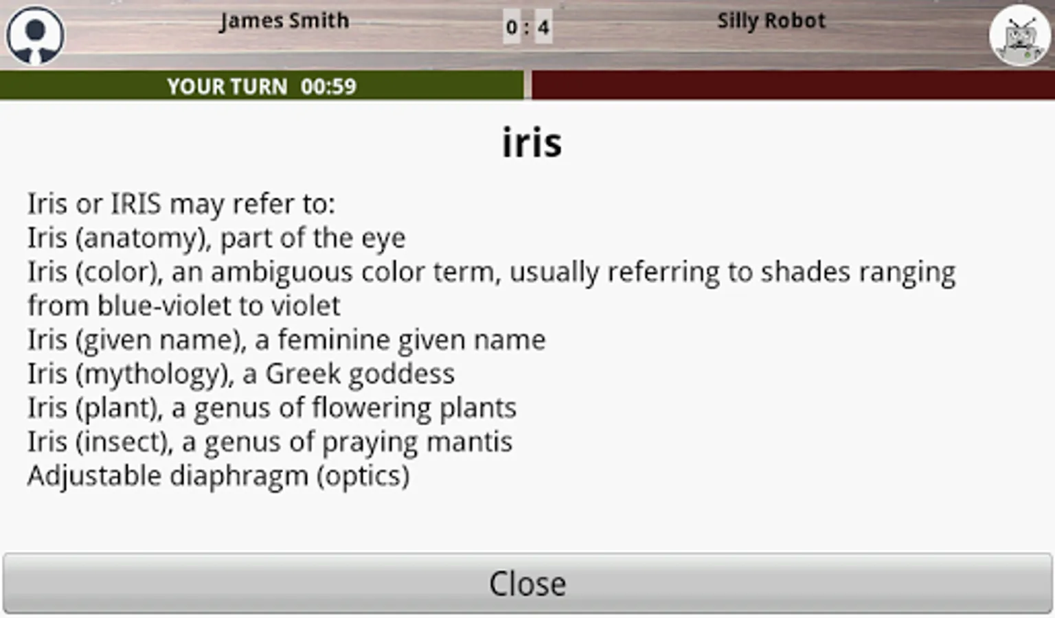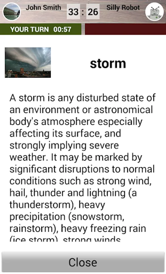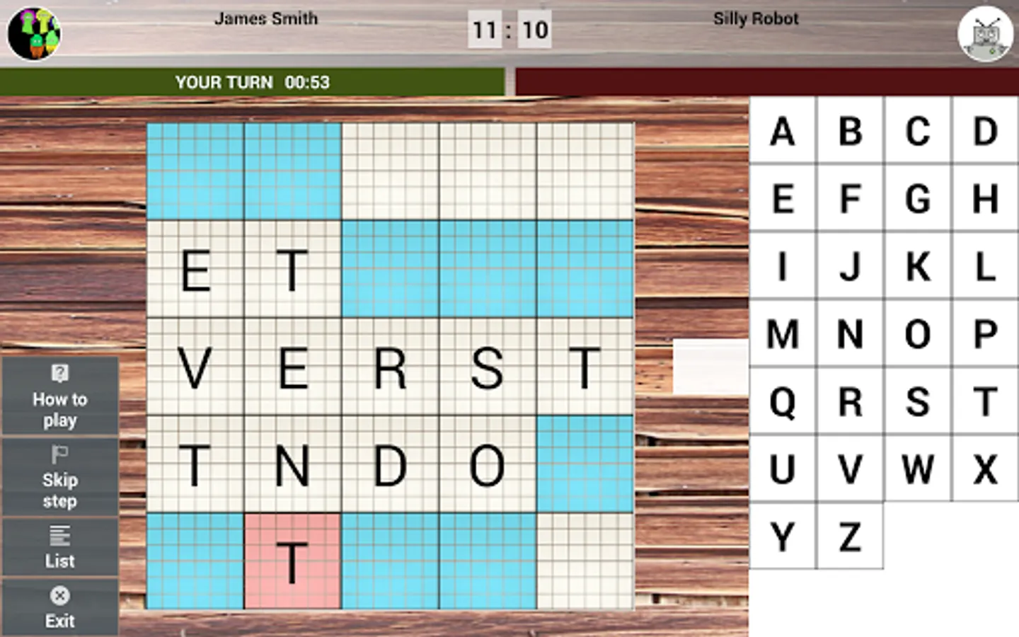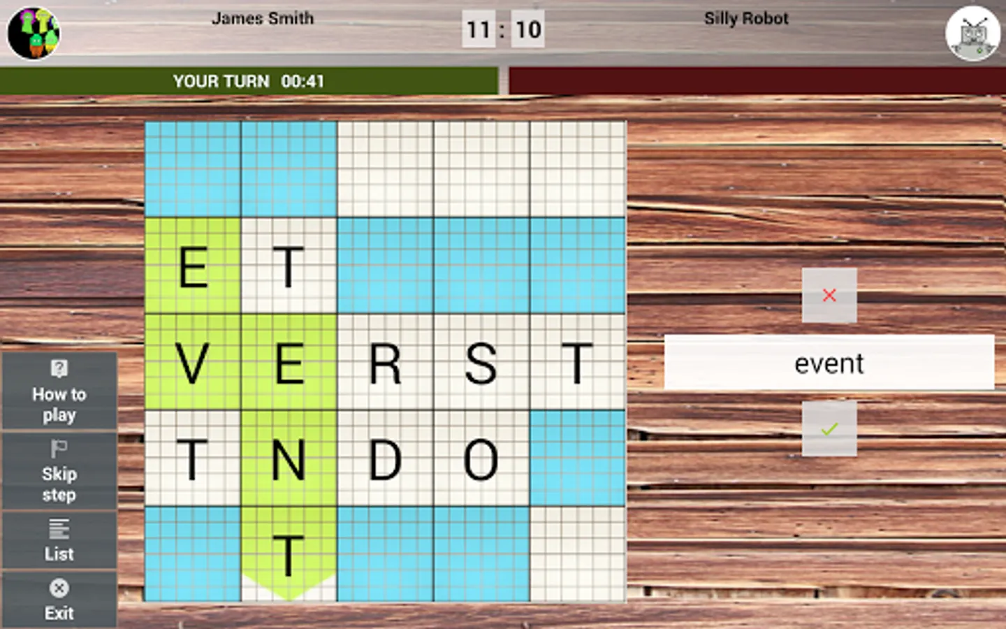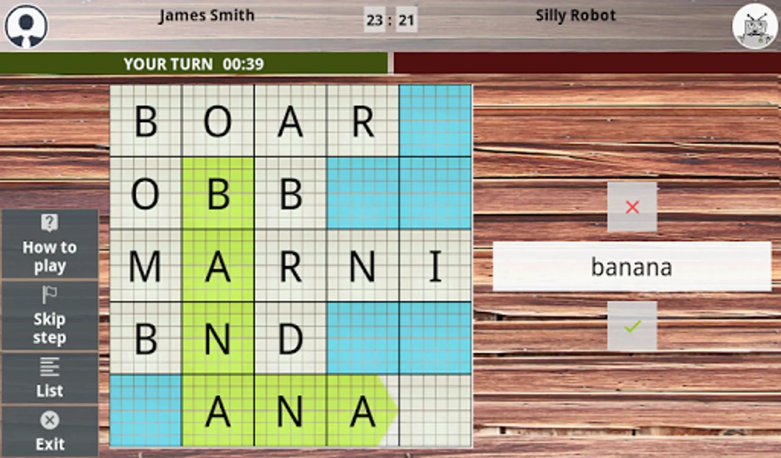 The game begins with the start word selected randomly. Players take turns. Player can add one letter at a time (must fill one free cell). Using this new letter and other letters on the game field player must be able to find a new word. This new word must contain new letter. The word stands out on the field continuously, in any direction, but not on the diagonal. The same cell can not be used twice in the one word. The same word can't be used twice during the game. Each cell contains only one letter and each letter brings one point to the player. Game ends when game field is full or players can't guess another word. The player who gets more points wins.
