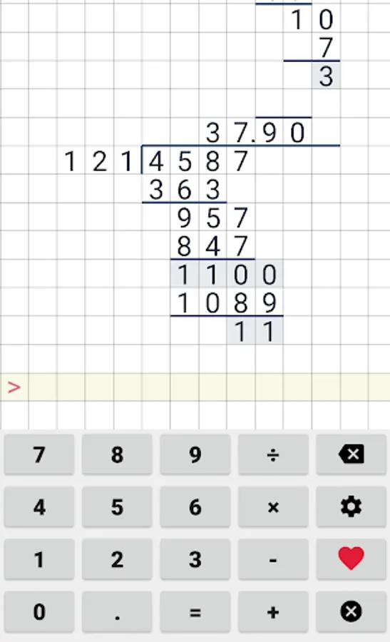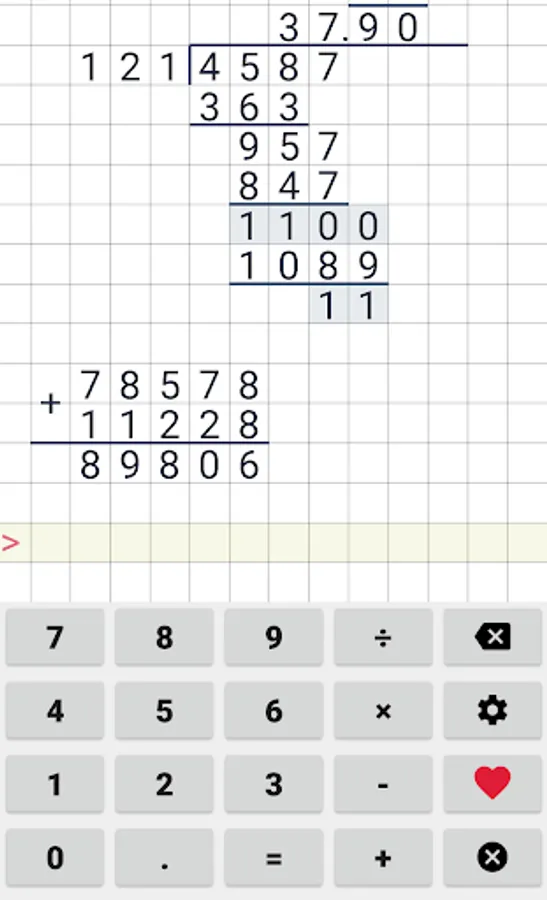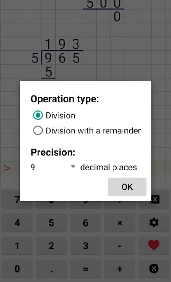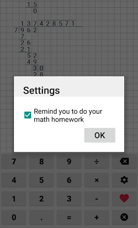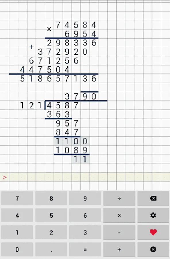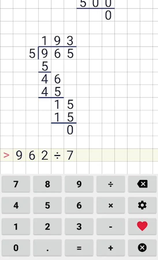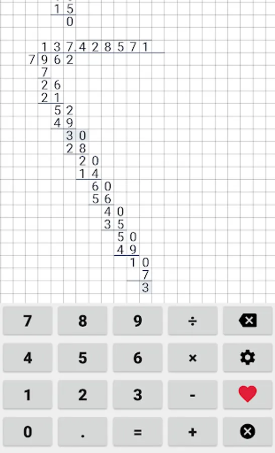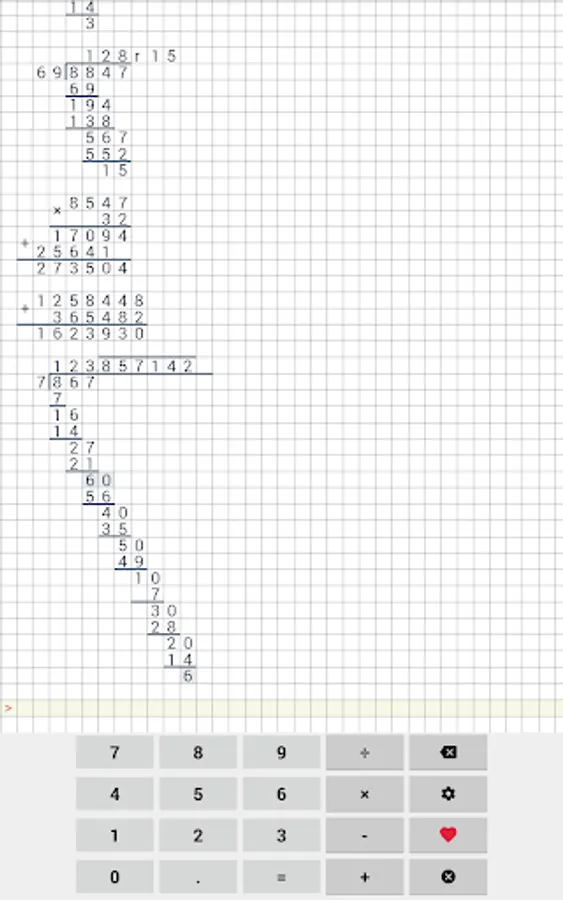 Easy to use school calculator. This calculator will help your with long division, long multiplication, addition & subtraction. This cheat calculator can help you with your math homework. Application supports division with reminders, long division and even repeating decimals.