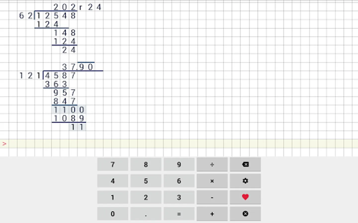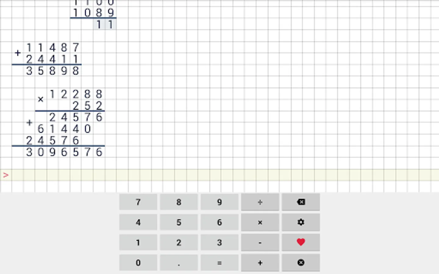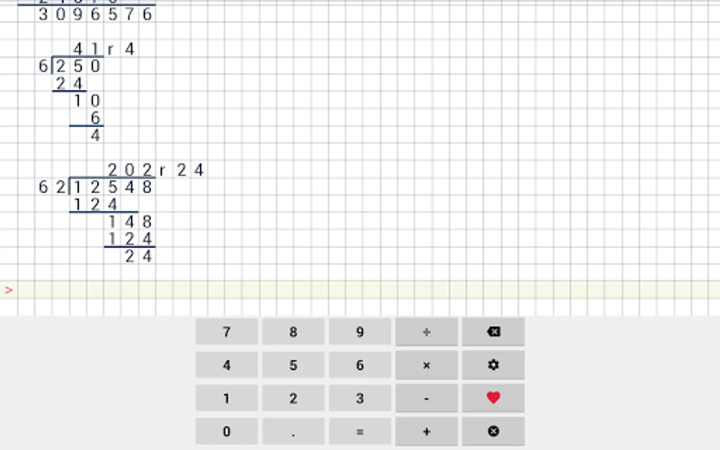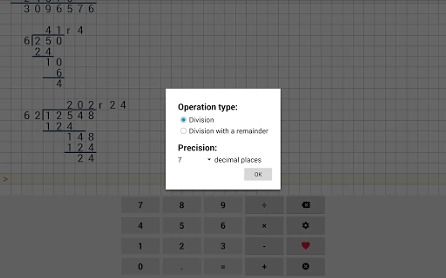 Easy to use school calculator. This calculator will help your with long division, long multiplication, addition & subtraction. This cheat calculator can help you with your math homework. Application supports division with reminders, long division and even repeating decimals.