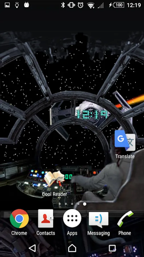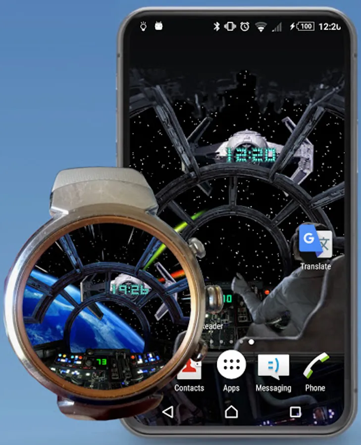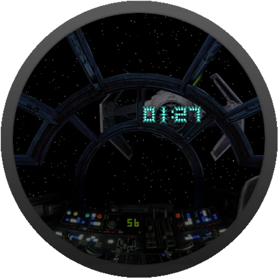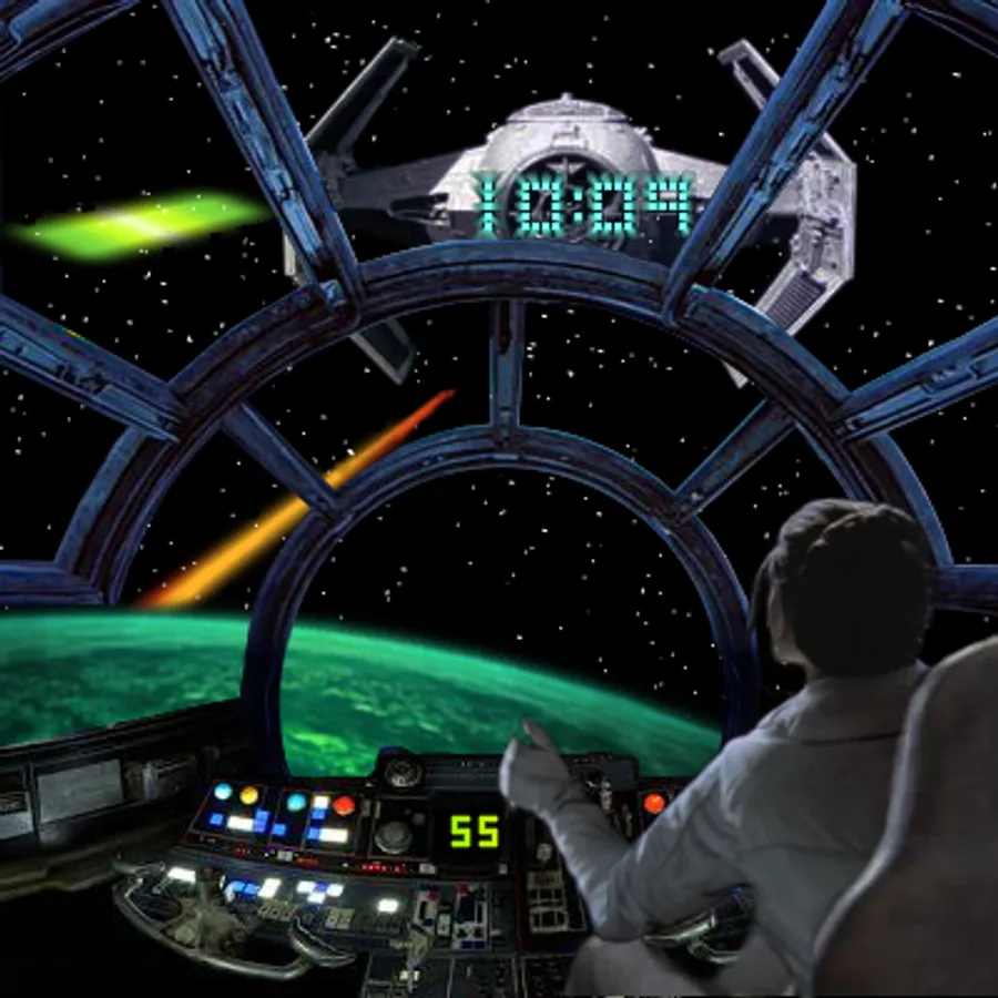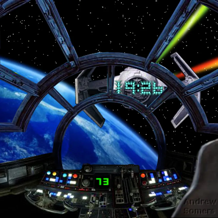 Space battle viewed from the cockpit. Laser fire exchanged above alien planets.
