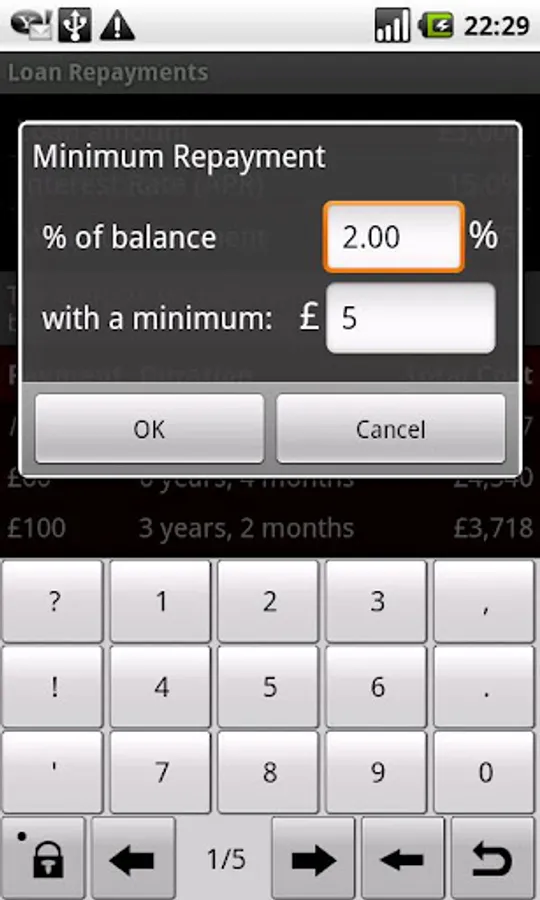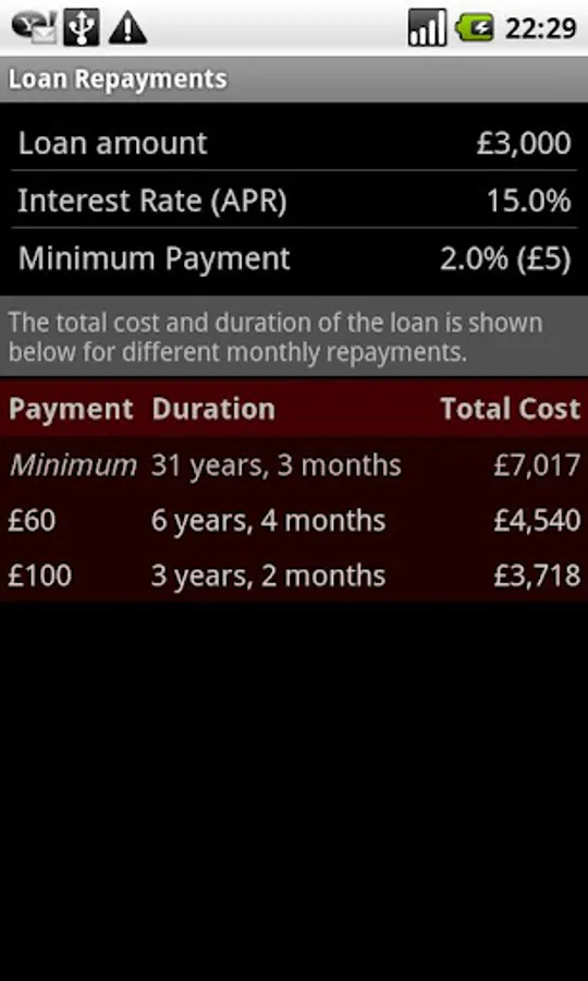 Calculate the cost of repaying loans and credit card debts using this simple application. Just enter your loan details and the minimum repayment amount.