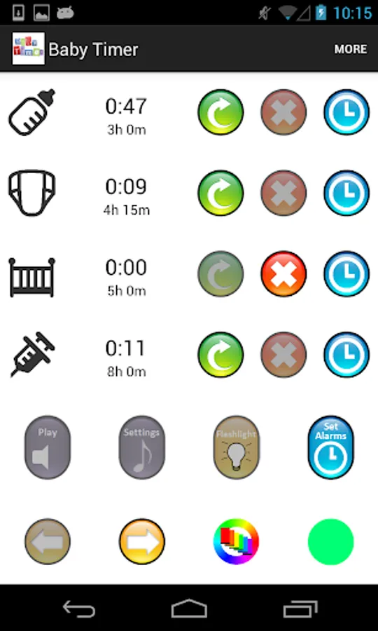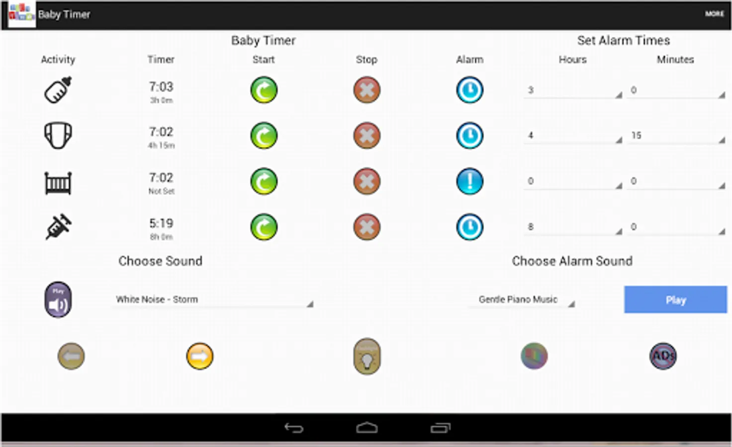 Newborn Baby Timer allows new moms to set separate timers and alarms for each activity (breastfeeding, diaper changes, etc). These alarms will help you remember when you need to wake your new baby boy or girl for another round of breastfeeding or another dose of medicine.