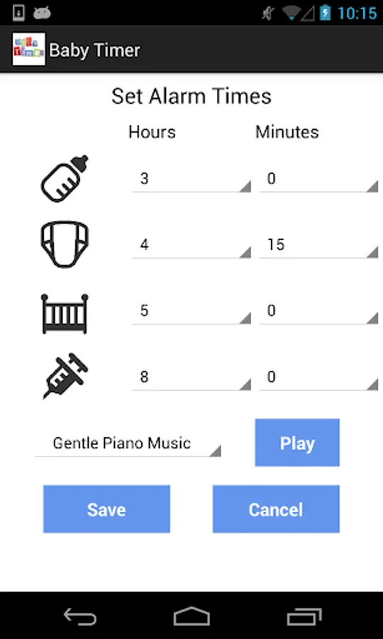 GENTLE ALARM SOUNDS: Since alarms can scare babies, Newborn Baby Timer’s alarms are configured to gently alert mom or dad that it is time to breastfeed, change a diaper, etc. Newborn Baby Timer has four alarm songs ranging from a lullaby to gentle piano music to a classical techno beat that will gently wake you up in the middle of the night to remind you that it's time to breastfeed, change a diaper, etc.