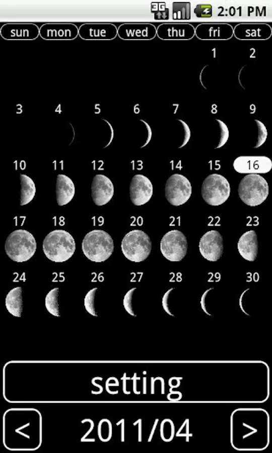 Moon phase display widget. Usage, HOME Press and hold the screen where there was none, "widgets" to select "MoonPhaseWidget" Please select. Click the widget to display a calendar for the current month of age. Click the Settings button, you can set your location.