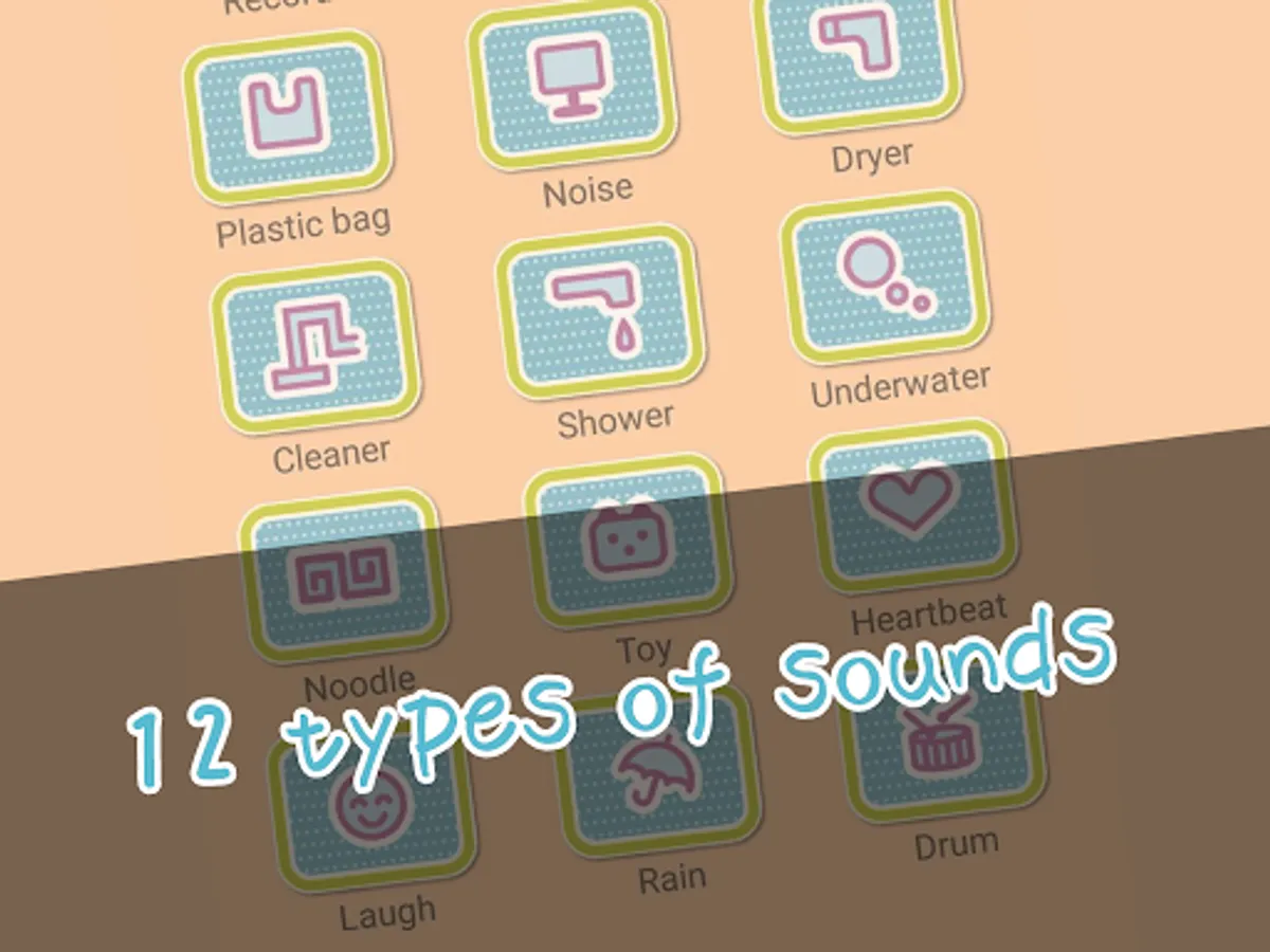 There are twelve sounds including "Plastic bag", "Noise", "Dryer", "Cleaner", "Shower", "Underwater", "Noodle", "Toy", "Heartbeat", "Laugh", "Rain", and "Drum".