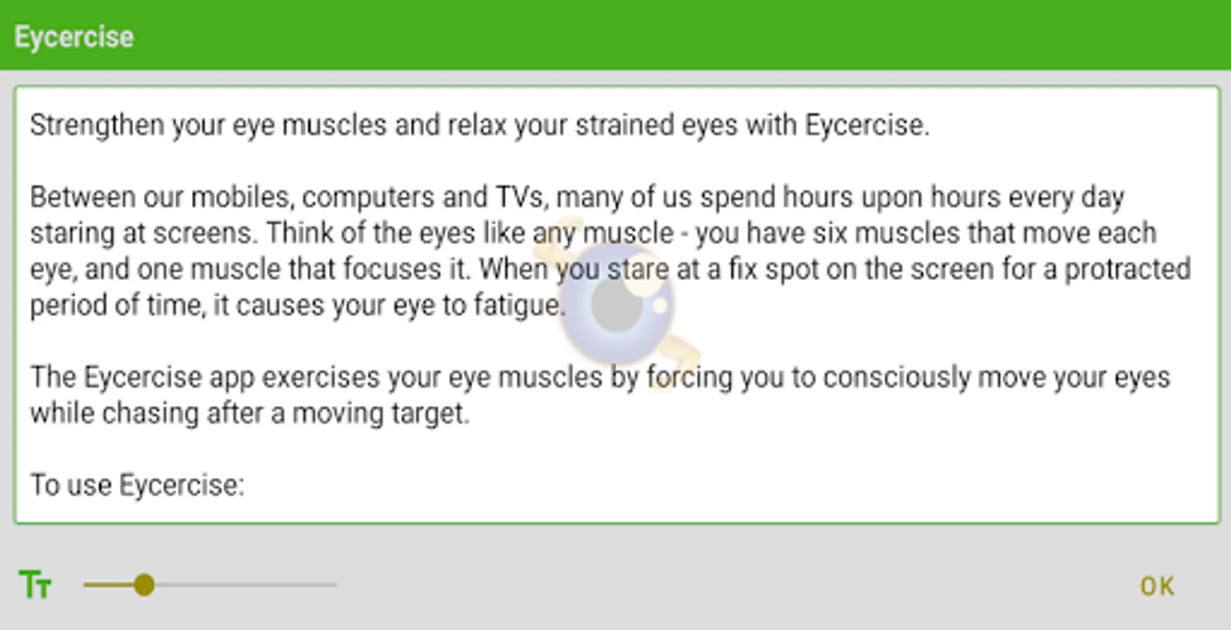 The Eycercise app exercises your eye muscles by forcing you to consciously move your eyes while chasing after a moving target.