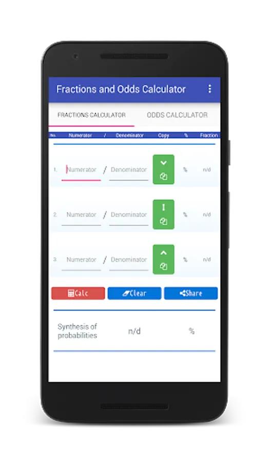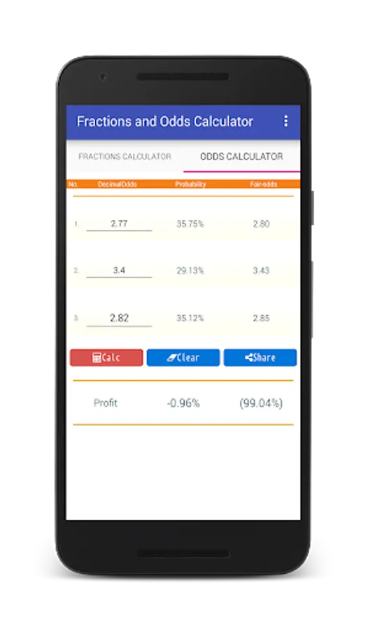 You can also calculate with the same denominator and different denominators with a single button.And you can calculate three odds and calculate fair odds.It can be used for phase odds calculations such as sports books.
