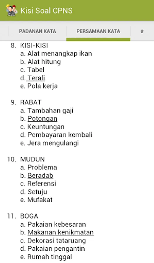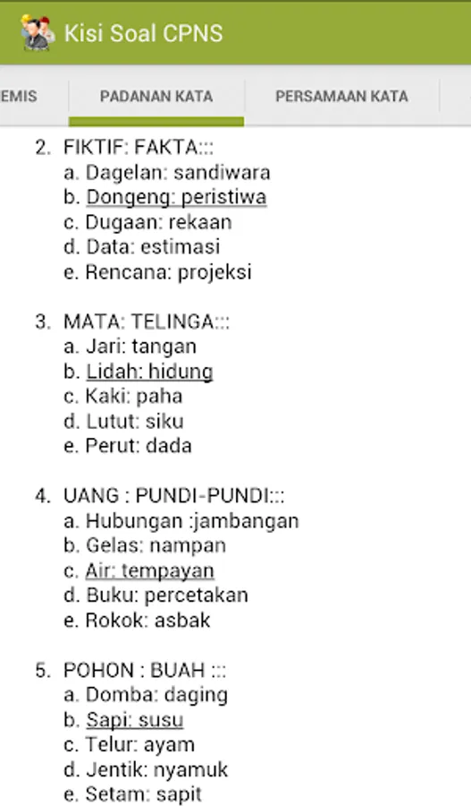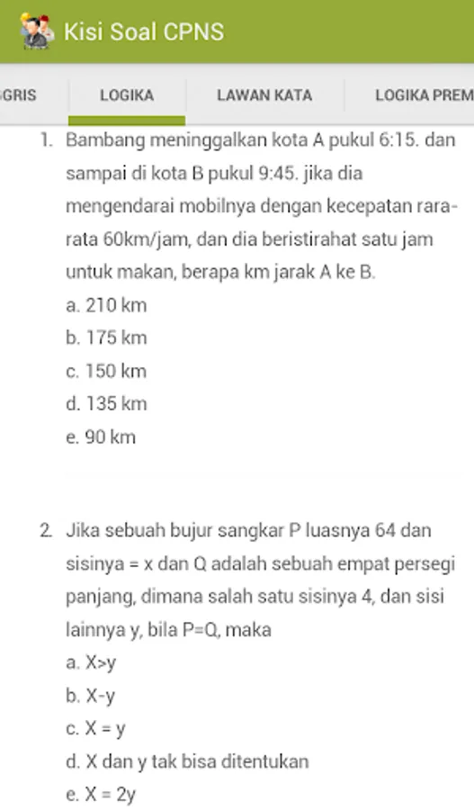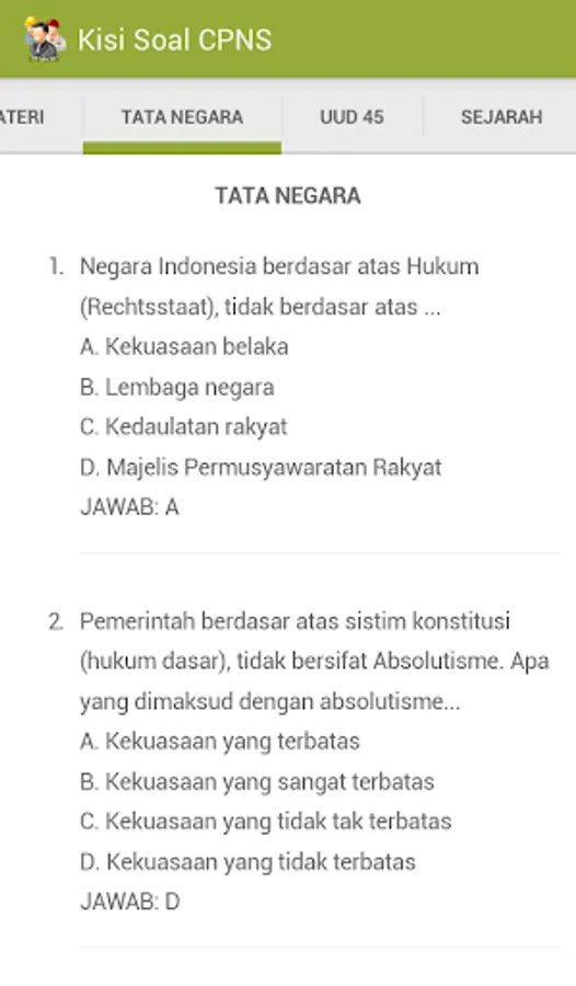 This application contains sample exam questions employess. Examples of questions on this application are taken from various sources on the Internet. Basically this application aims to help fellow colleagues who wish to take the exam tests employess. By reading about the shape and the expected sample questions you can understand and know about the forms that will be tested on the test CPNS.
