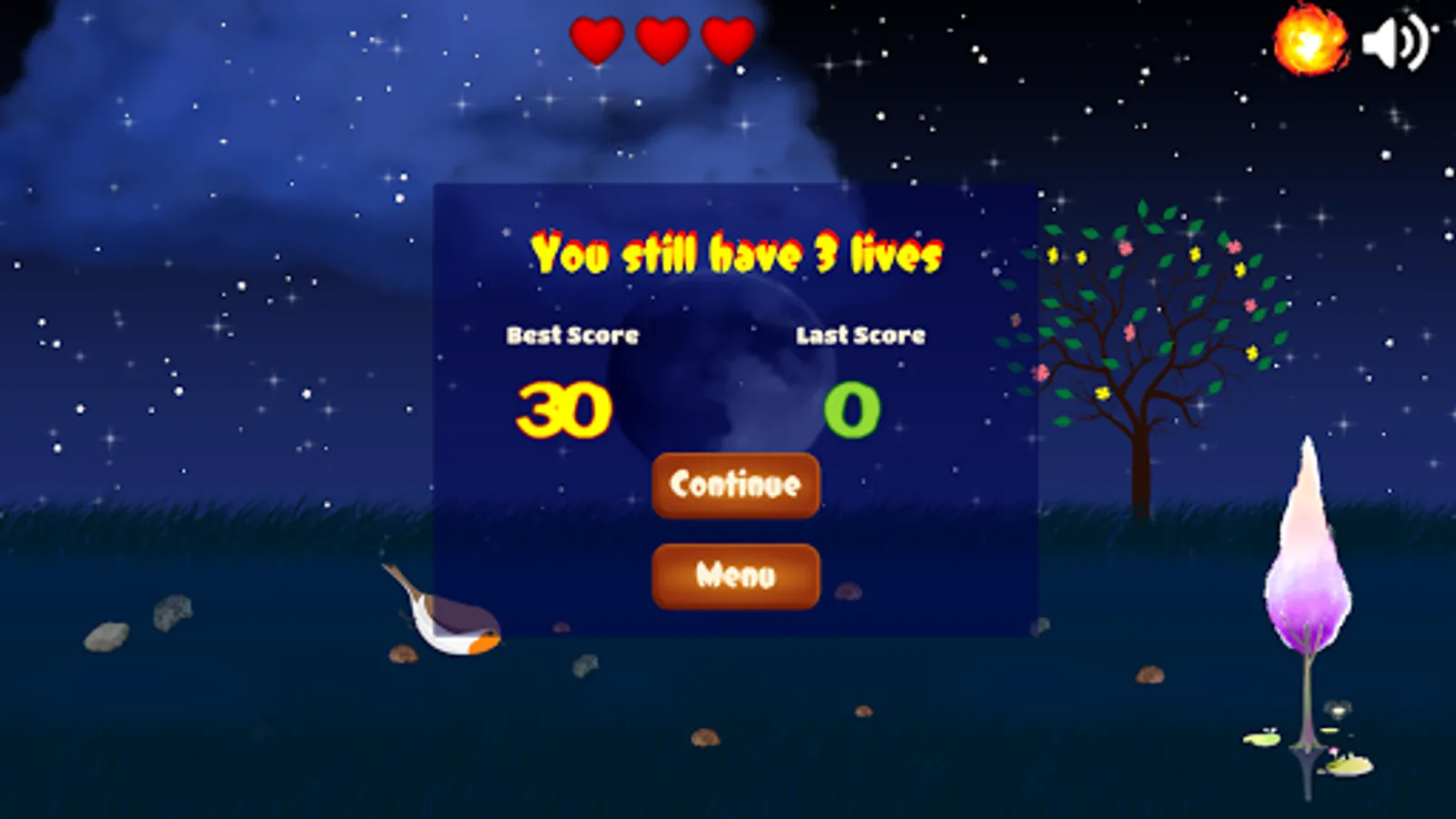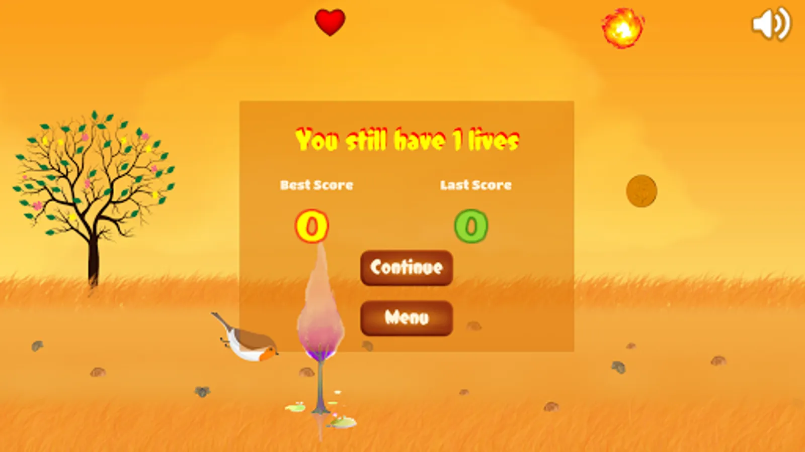 The Lovely bird flies and flies.. its duty is collecting coins much as well, however it needs to avoid the tree with fireball, if not it will die.