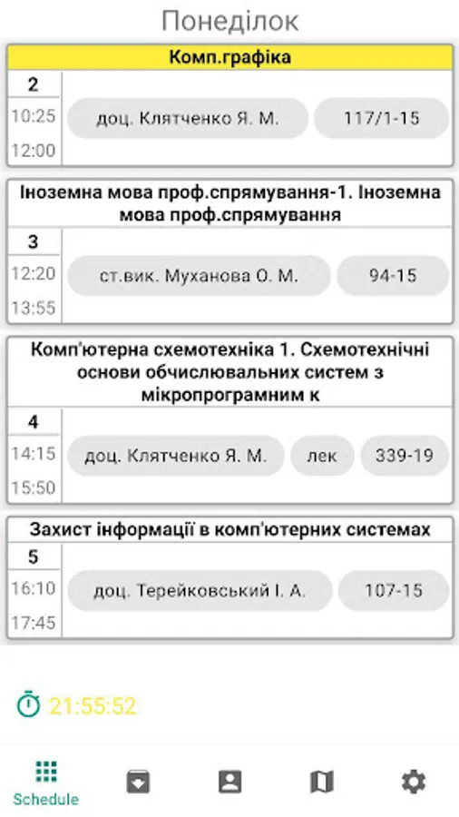 An application that allows you to conveniently view information about couples, teacher ratings, and leave notes. Also included in the app is a timer that lets you know the exact time before the start / end of the pair.
