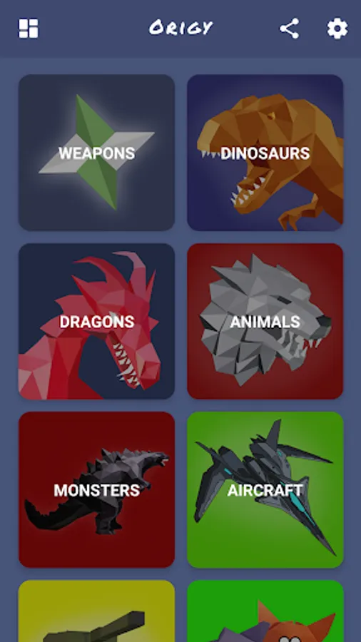 At first, each origami figure is hidden and invisible, but gradually you will get different cool weapons, planes, rockets, dinosaurs, animals and paper dragons.