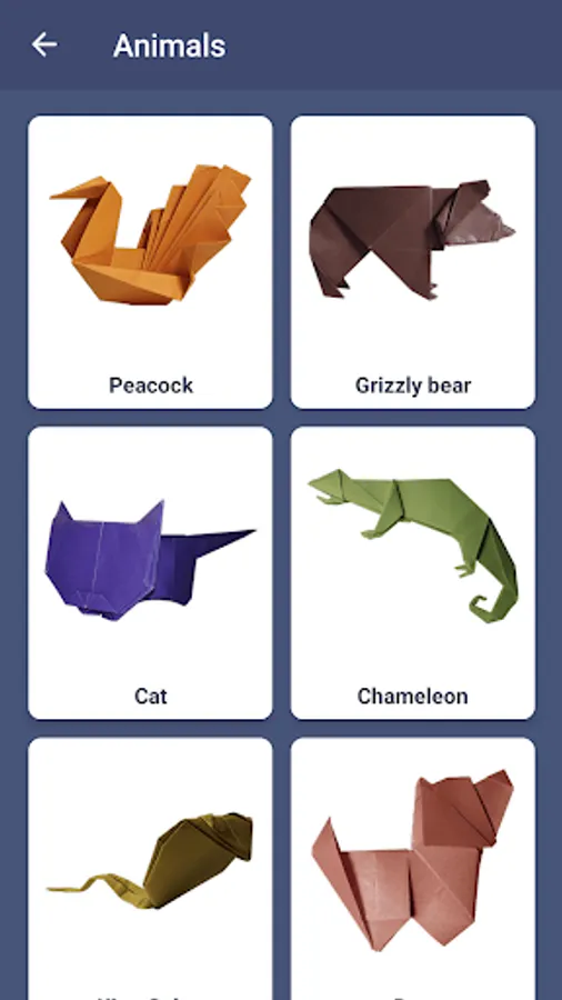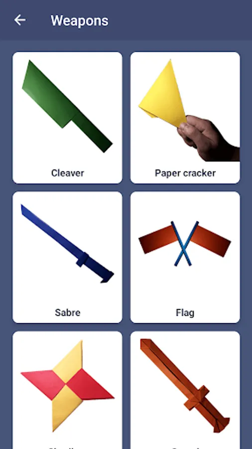 The application contains not only simple, but also complex paper origami instructions. Step-by-step diagrams will help you create paper models of any complexity. All stages are depicted as clearly as possible. To perform simple manipulations to create paper weapons, animals, dinosaurs, airplanes, you will need the diagrams from the application and plain colored paper. White paper can also be used. The choice of color and paper size depends on your preference. Making origami weapons or animals is easy. It is enough - carefully and carefully follow the steps from the instructions. For some origami, you can use glue or tape.