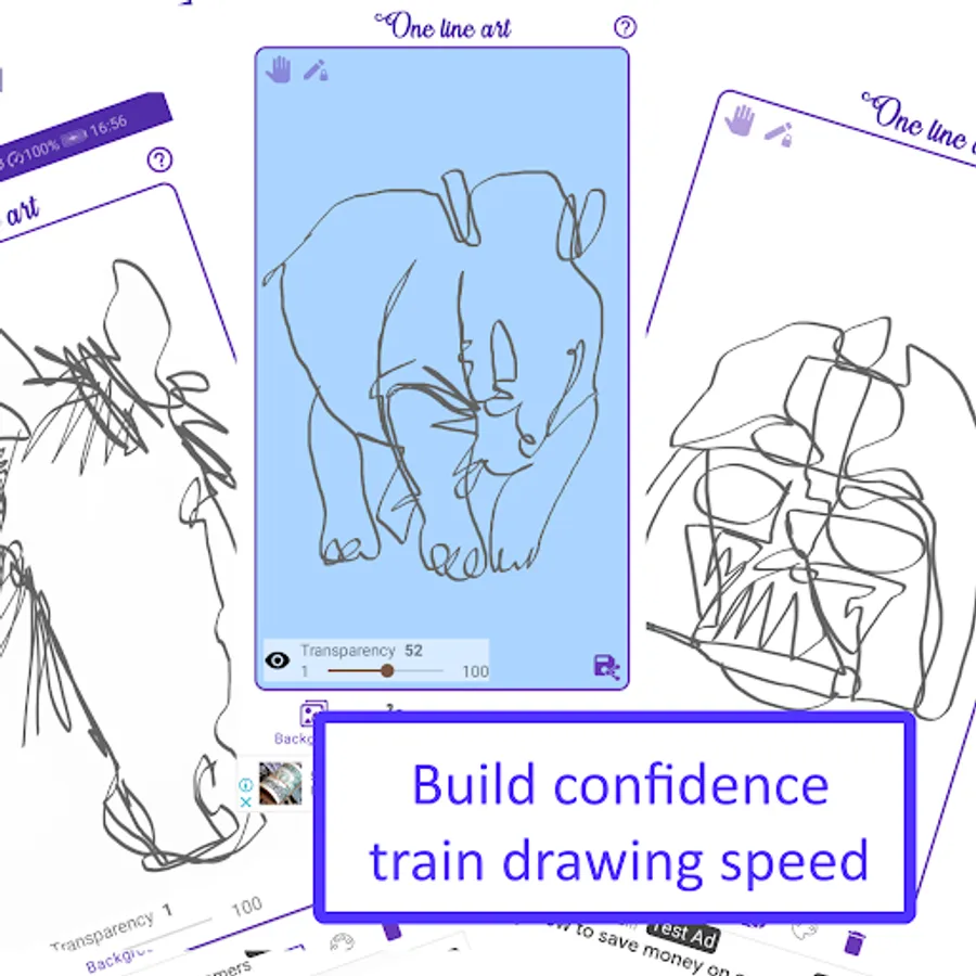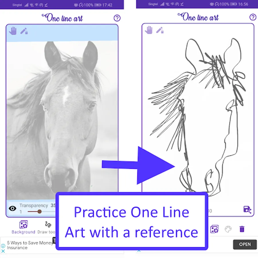 A continuous line art is created by drawing on a surface without ever lifting the brush from the page, such that the drawing is one free-flowing and unbroken line. This means that the brush must move to and fro around the surface, with lines doubling back on each other to represent both the outlines and internal shapes.