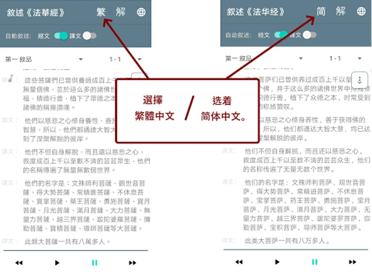 This application is a simple narration/recitation software of "Miao Dharma Lotus Scripture + Translation Explanation".