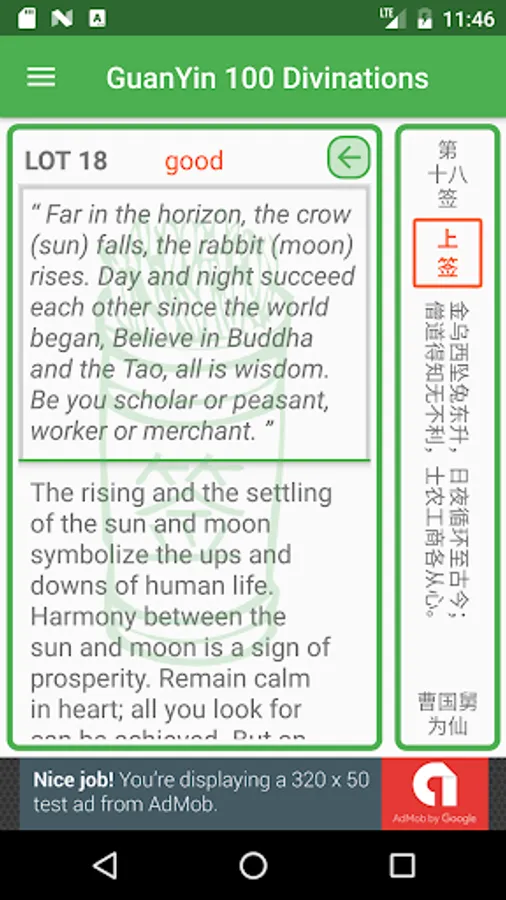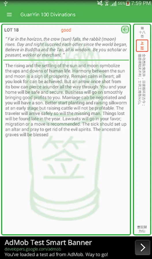 Simply select the lot number on the app to display the corresponding English translation of the divination verse as well as its interpretation.