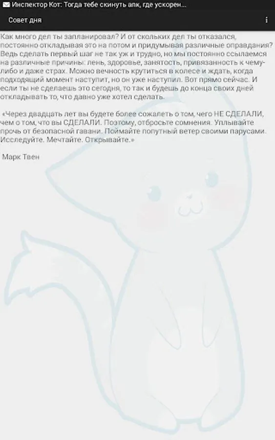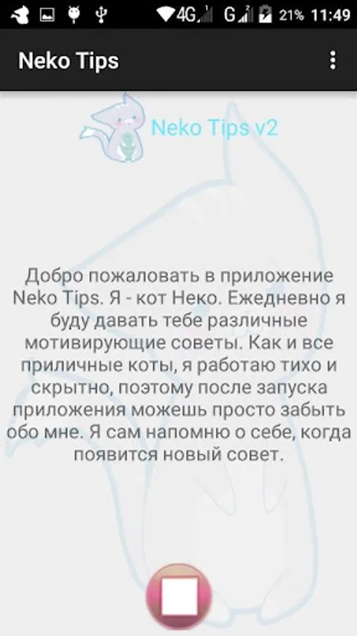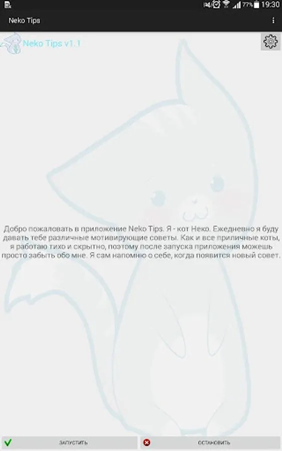 Neko Tips - an app that every day will give motivational tips. These tips will help you not only self-motivated themselves, but will look at the rest of your life on the other side. The application can be run and forget about it, it itself will make itself felt, when the time comes.