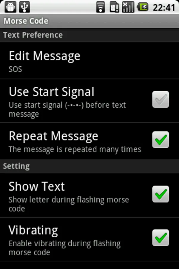 Morse Code blinks your phone in different colors and it is very configurable allowing you to customize color, sound and messages.