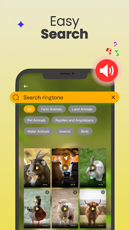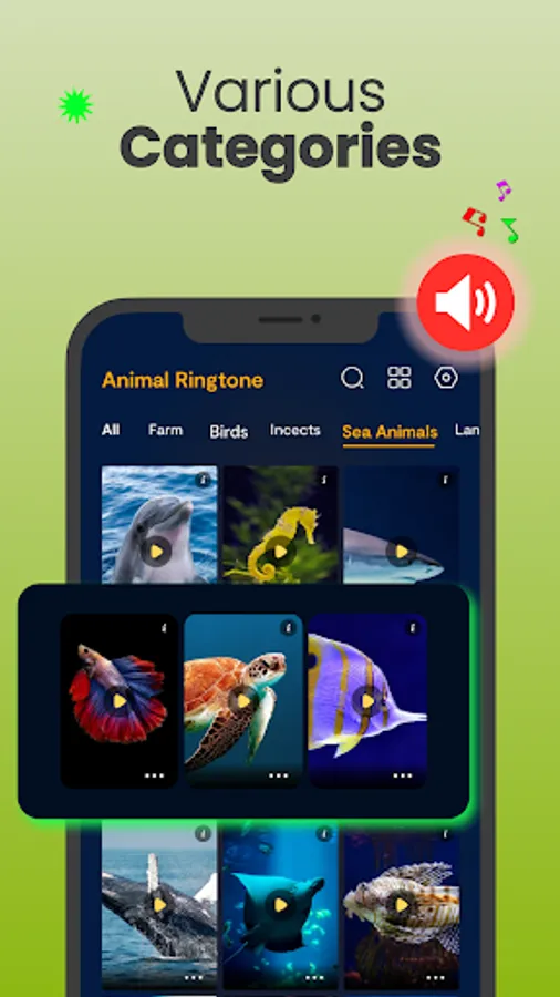 You can set your favorite sounds as ringtones, notification tone, or alarm sound using our animal noises ringtone feature. Choose from wide variety of animal voice including pet animals sounds like dog sounds or cat sounds, insects sound or wolf sounds.