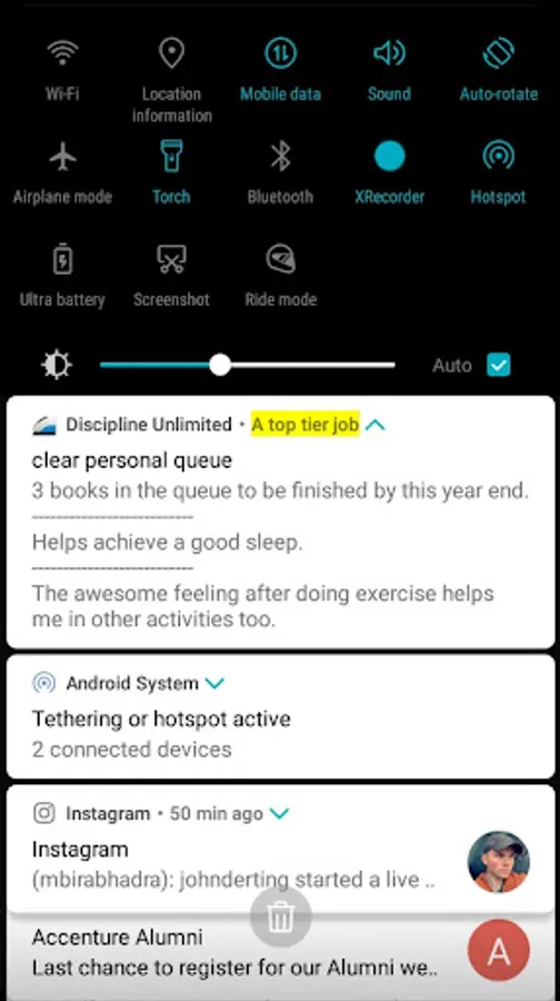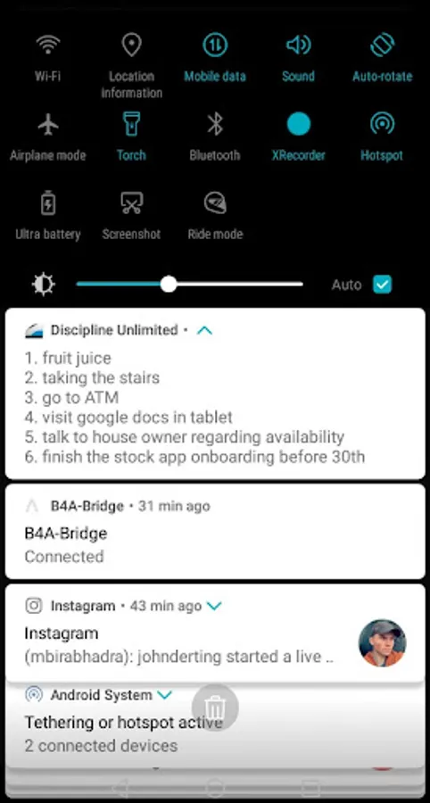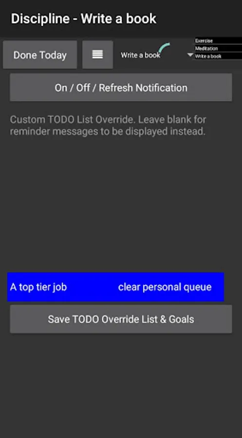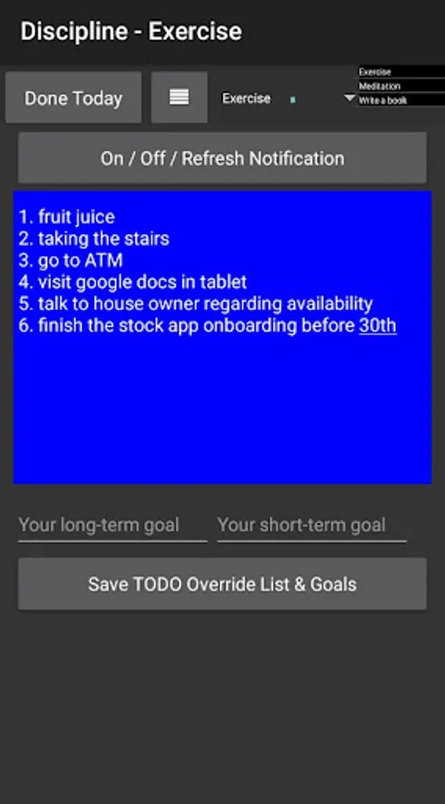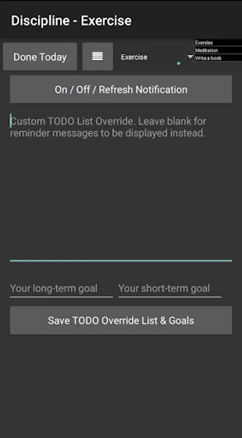 The App can function independently as a TODO List on the notification panel when you are not using reminder notes for habits. Add to that you have a long term and short goal display option on the same notification panel note.