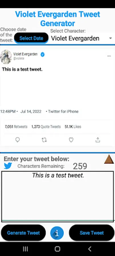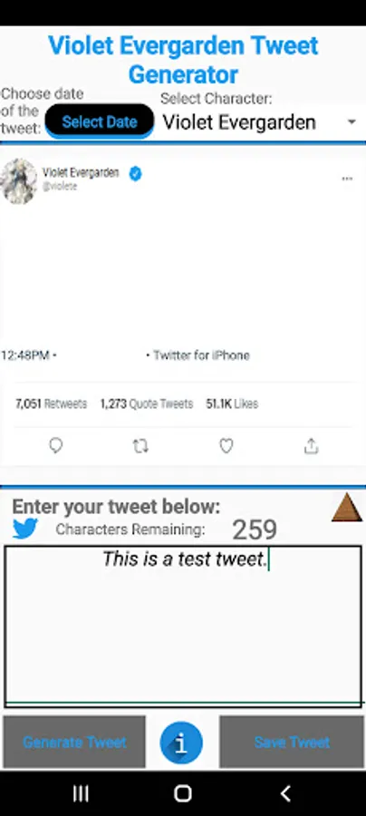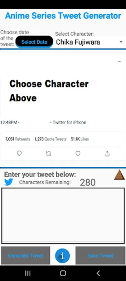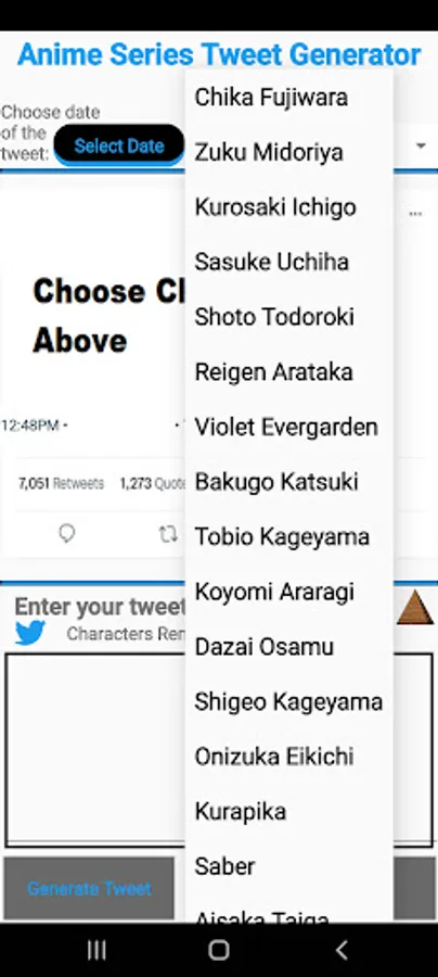 There are 50 of the most popular anime characters who have individual tweet generators available for download. These apps create memes of tweets you create as if they were sent from the character.