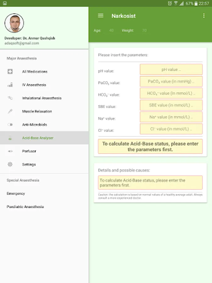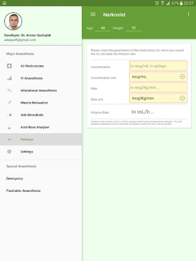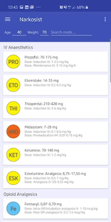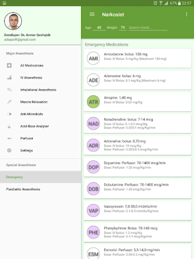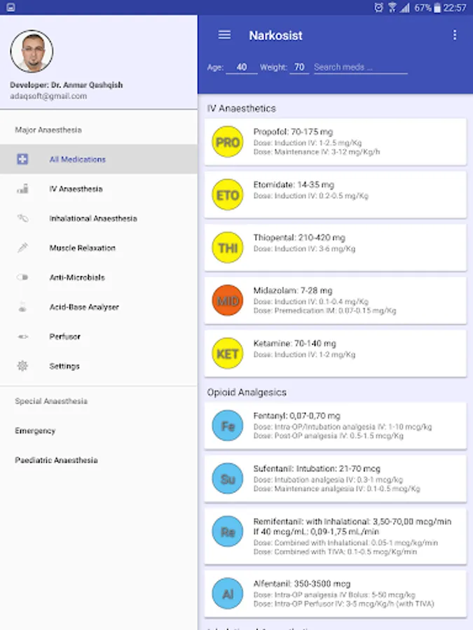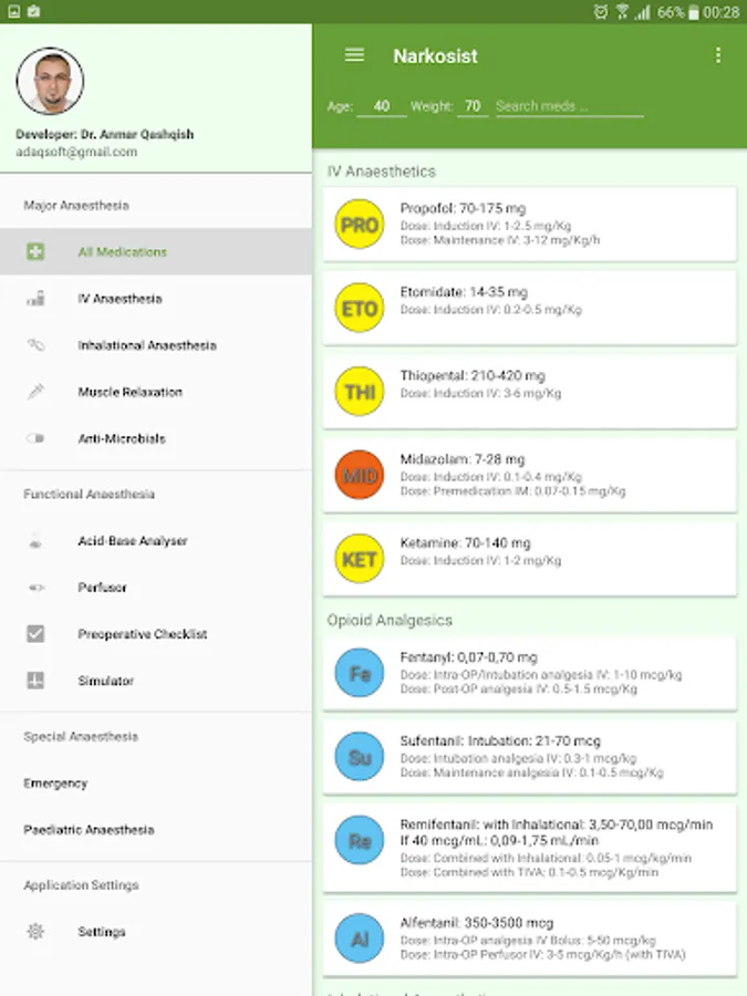 This app provides basic and general information about daily anesthesia medications and their dosing based on basic literature of anesthesiology. It consists of a modern and nice looking interface with integrated navigation panel and easy-to-use groups of medications. The app is meant to target professional anesthetists and anesthesia residents.
