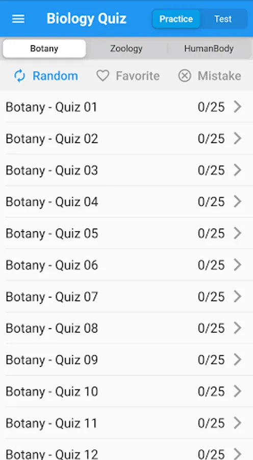 - 65+ sets of Quiz each with 25 questions in botany, zoology and human body