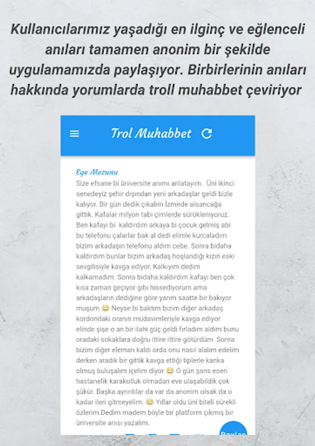 Unlike social platforms that have turned into politics, fights and wannabe posts, Troll Conversation is a platform where users anonymously talk about interesting and entertaining memories in their lives, talk about them and have fun.